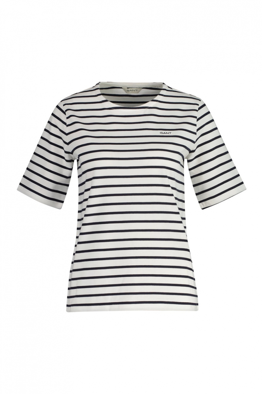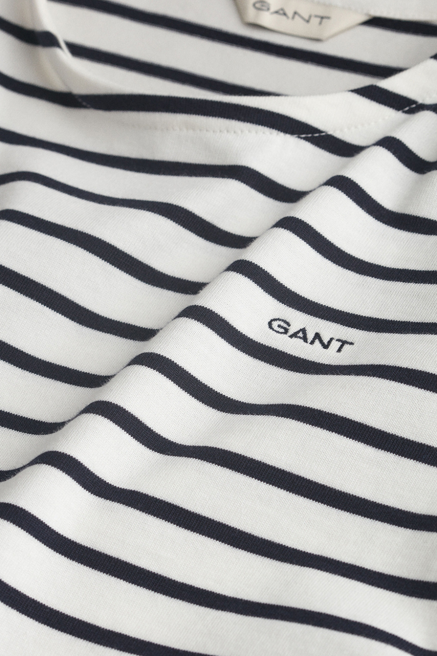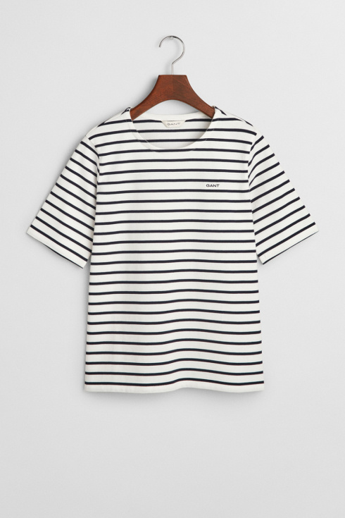 This striped top is a declaration of love for timeless marine inspiration. With its soft cotton fabric and simple silhouette, it is an obvious choice for both casual and elegant looks. Perfect for the modern wardrobe - always right, always stylish.Striped top in cotton with a round neckline, short sleeves, small embroidered logo front and relaxed fit from Gant.
