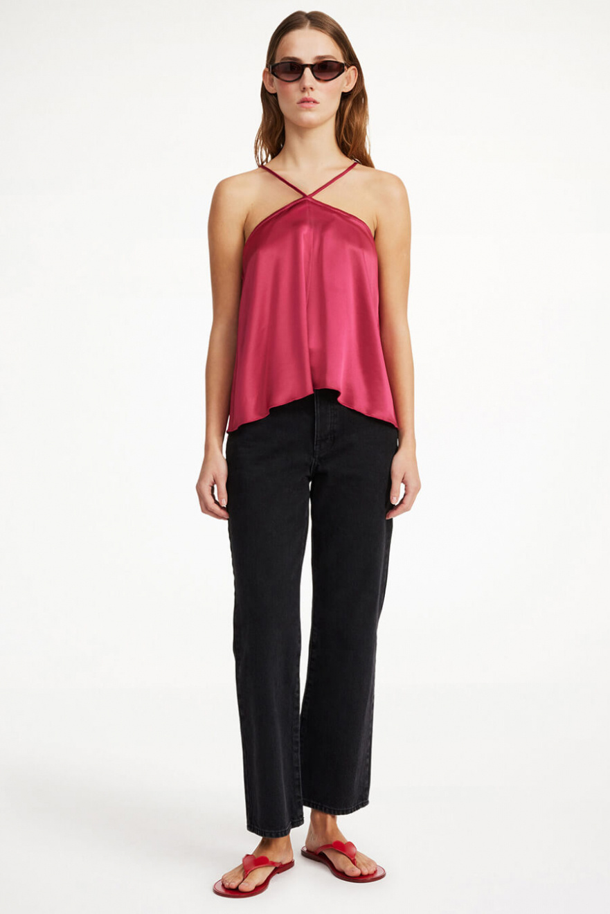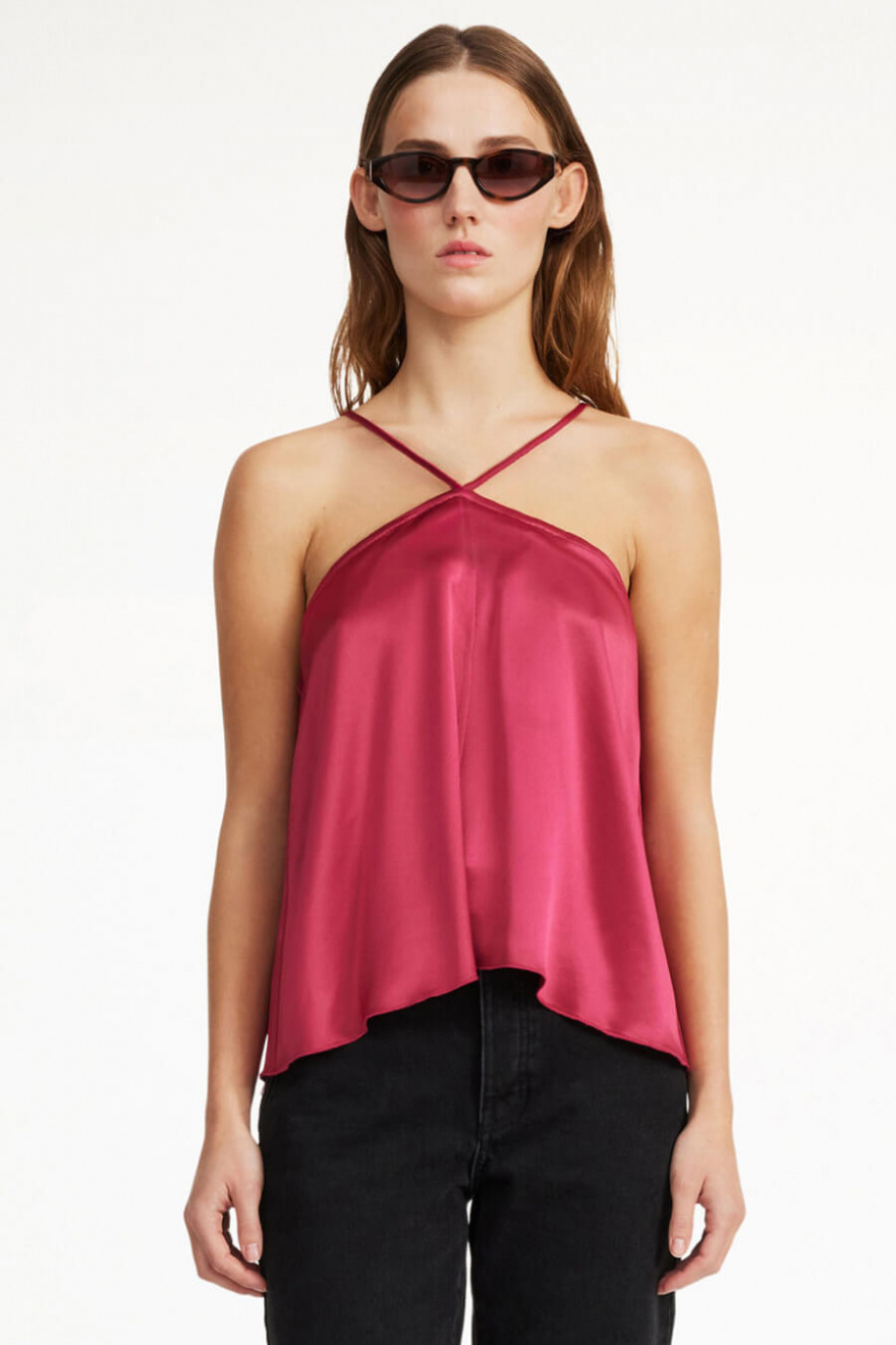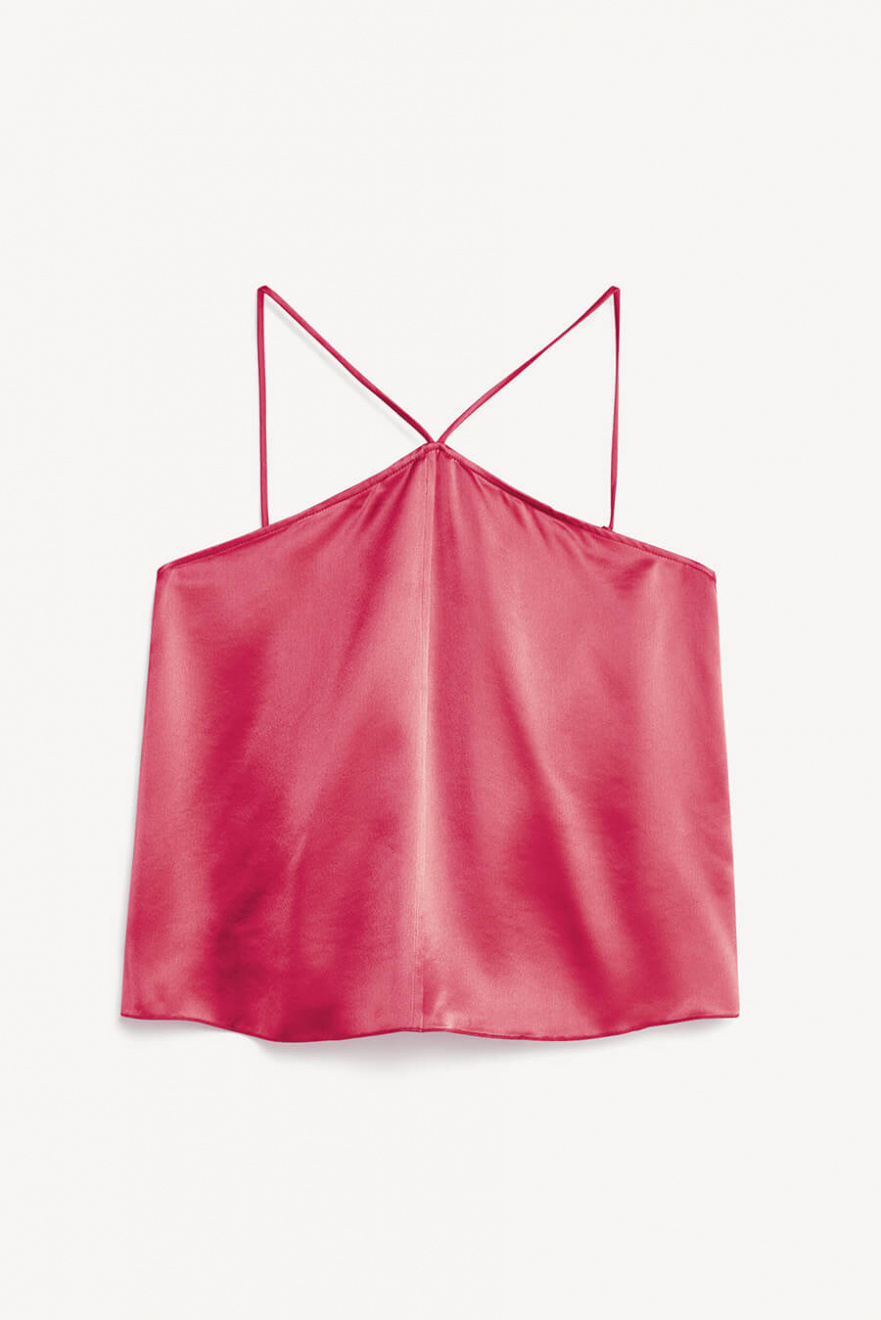 Shimmering top with halter neck, loose fit and adjustable shoulder straps from By Malene Birger.- 78% Acetate 22% Polyester