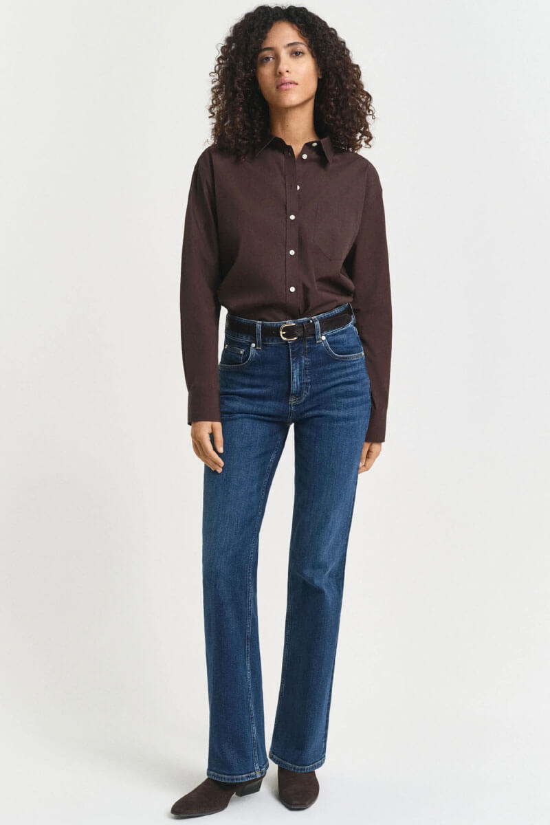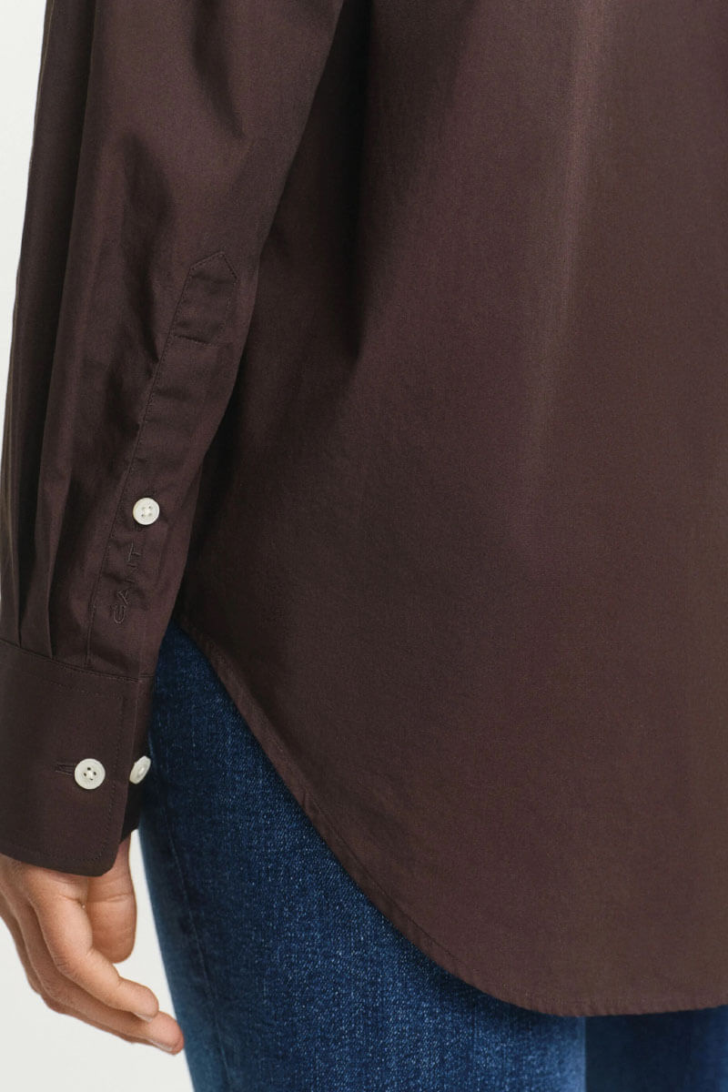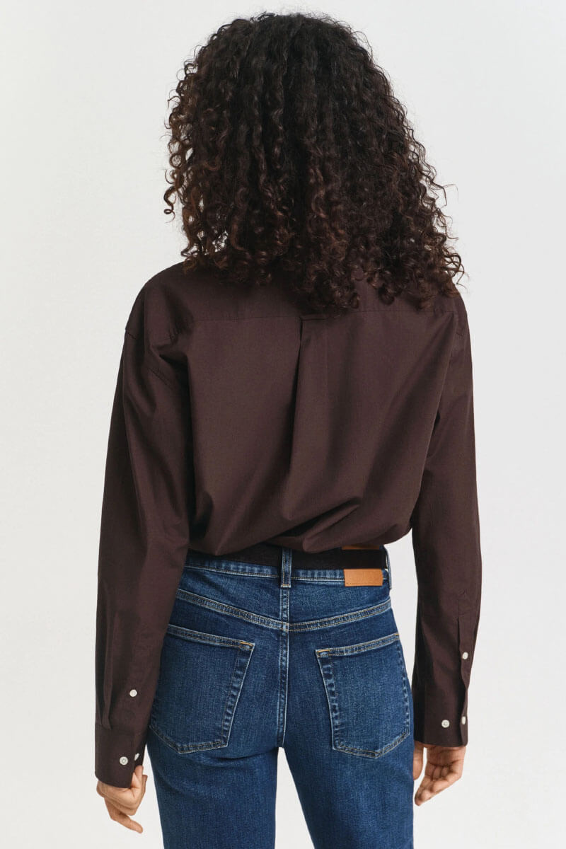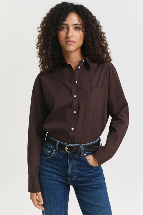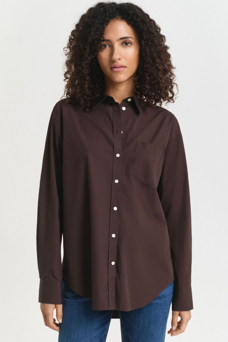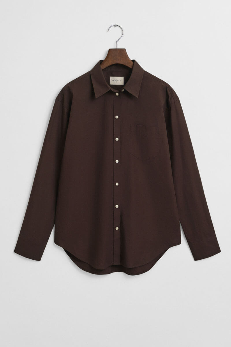 A dark brown cotton shirt in a relaxed fit is as obvious with tailored wool trousers as it is with worn jeans. Button all the way down for minimalist sharpness, or leave it open over a slim polo shirt for a casual, sophisticated fall look.Dark brown in cotton with relaxed fit, collar, chest pocket and button closure front from Gant.