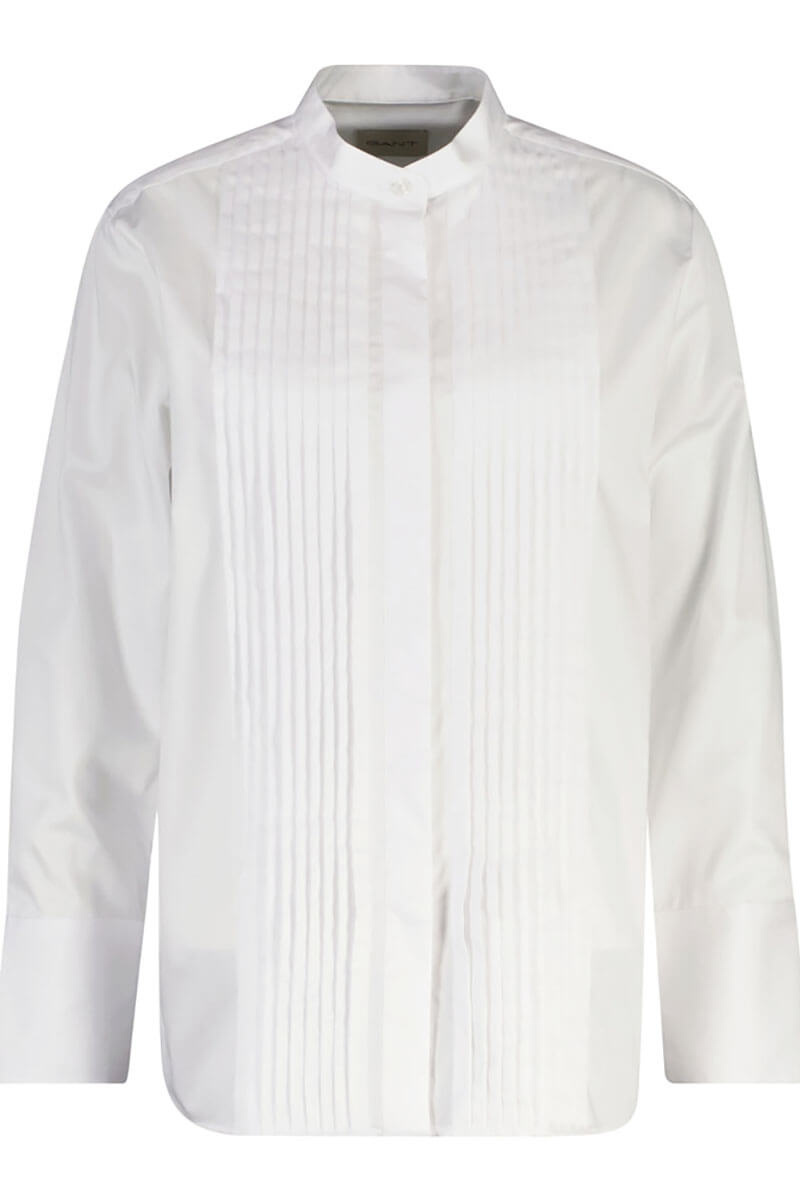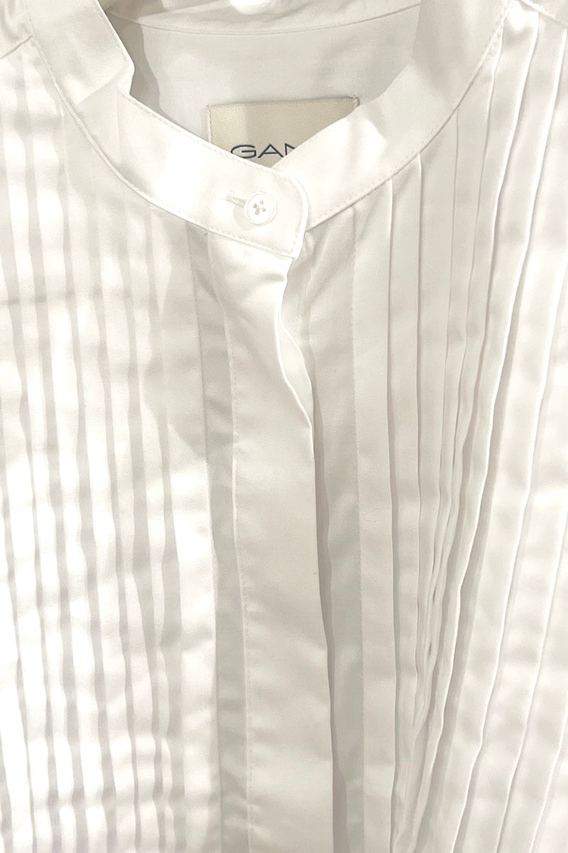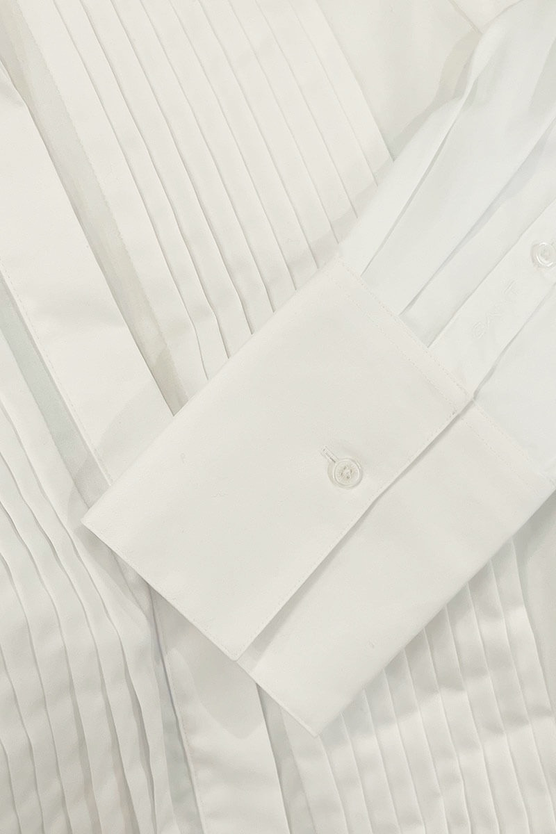 Tuxedo shirt in soft cotton satin with front pleats that will make you feel ready for dinner or a party. Always a favorite paired with a chic skirt or elegant trousers. This one features front pleats, a small collar, and a relaxed fit — almost like you borrowed it from him. For a more fitted look, go down one size.