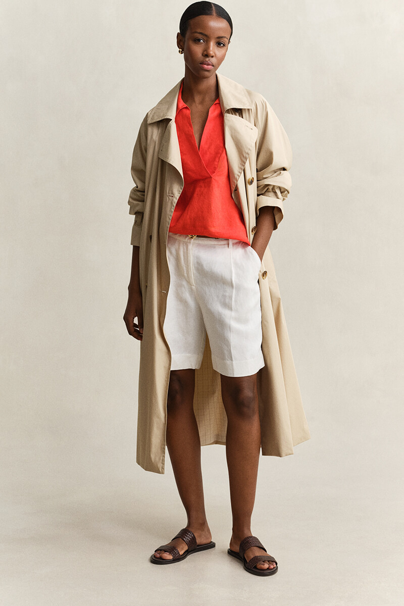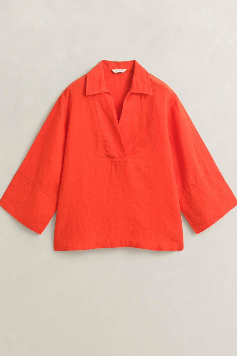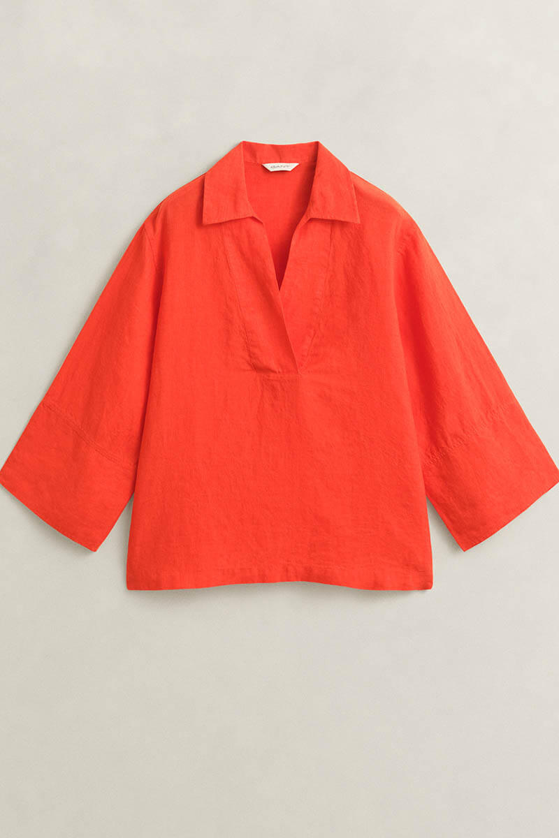 A chic linen blouse featuring a slit at the sleeves, a flattering V-neck, and a classic collar. This blouse is made from certified European linen – a lightweight, naturally breathable fiber that feels cool and comfortable against the skin.