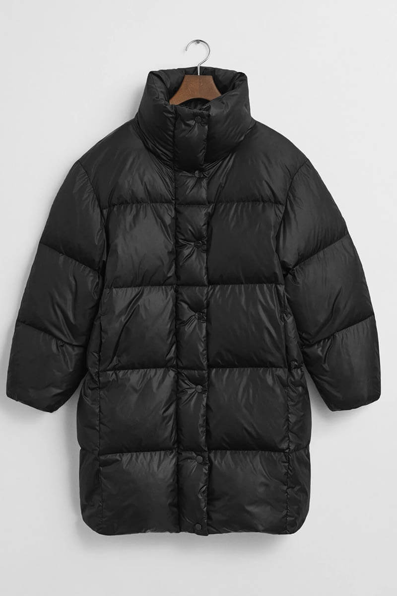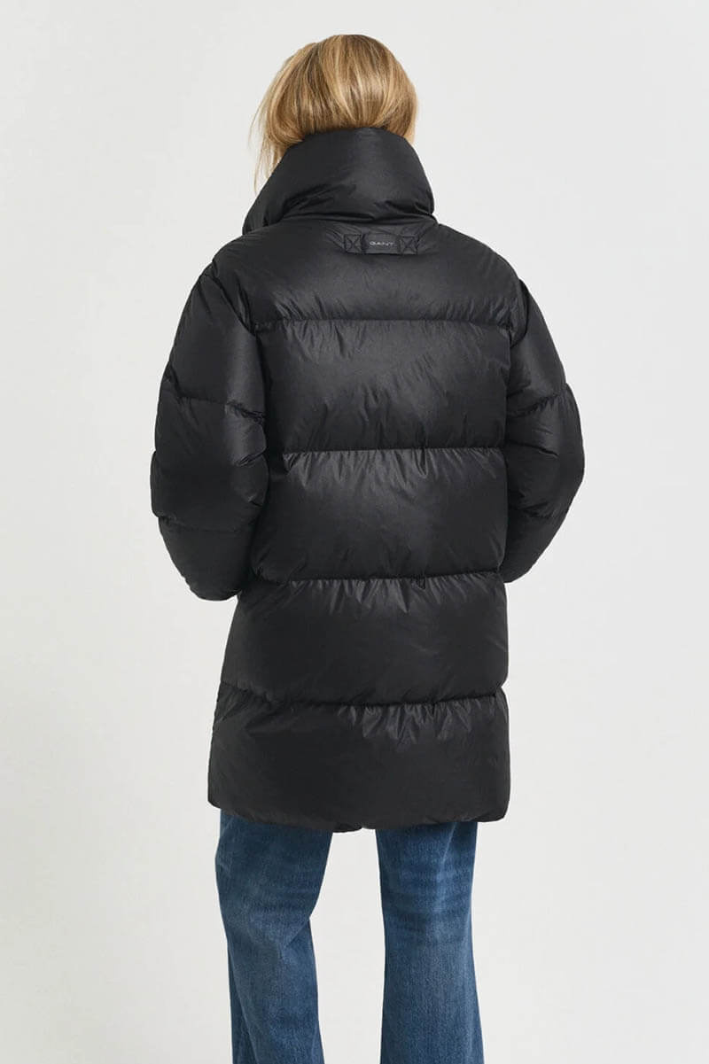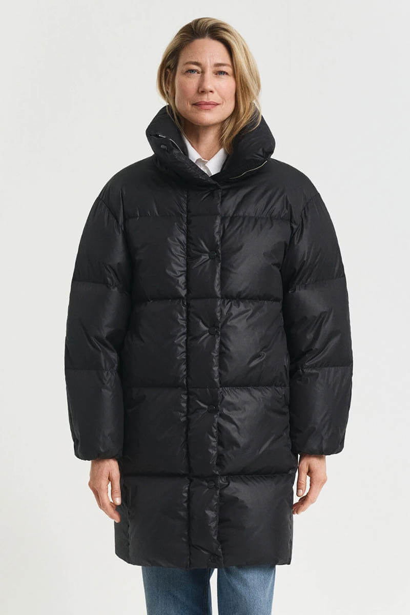 The black down coat is perfect for the colder seasons. Style it over a shirt and slim trousers for the office, or with a knitted dress and boots for the weekend.Down coat that ends mid-thigh, button closure at the front, high collar, front pockets, and a straight fit from Gant.