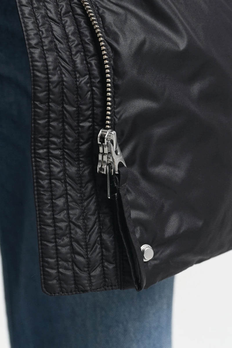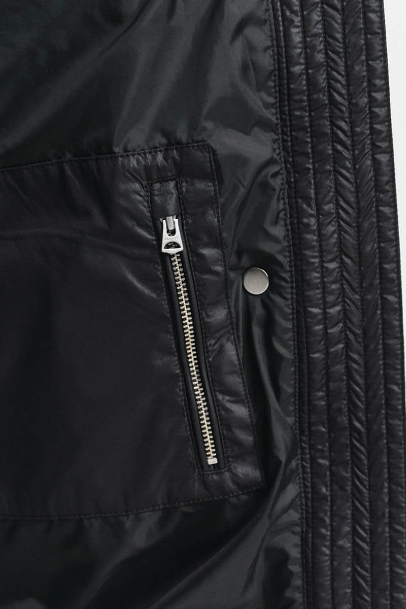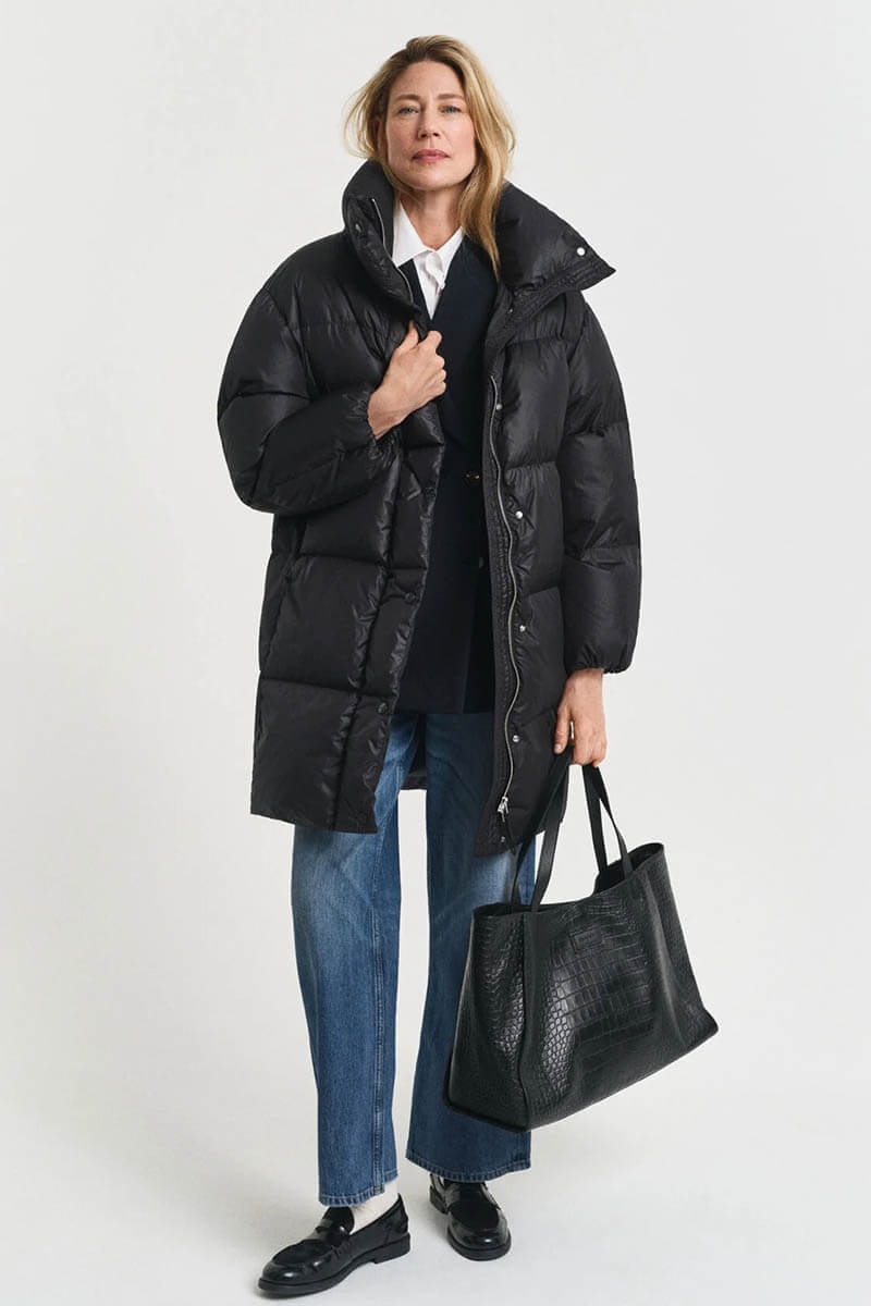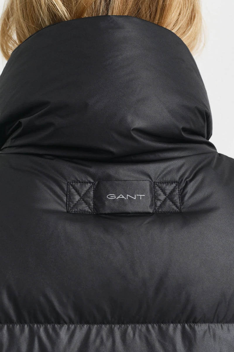 The black down coat is perfect for the colder seasons. Style it over a shirt and slim trousers for the office, or with a knitted dress and boots for the weekend.Down coat that ends mid-thigh, button closure at the front, high collar, front pockets, and a straight fit from Gant.