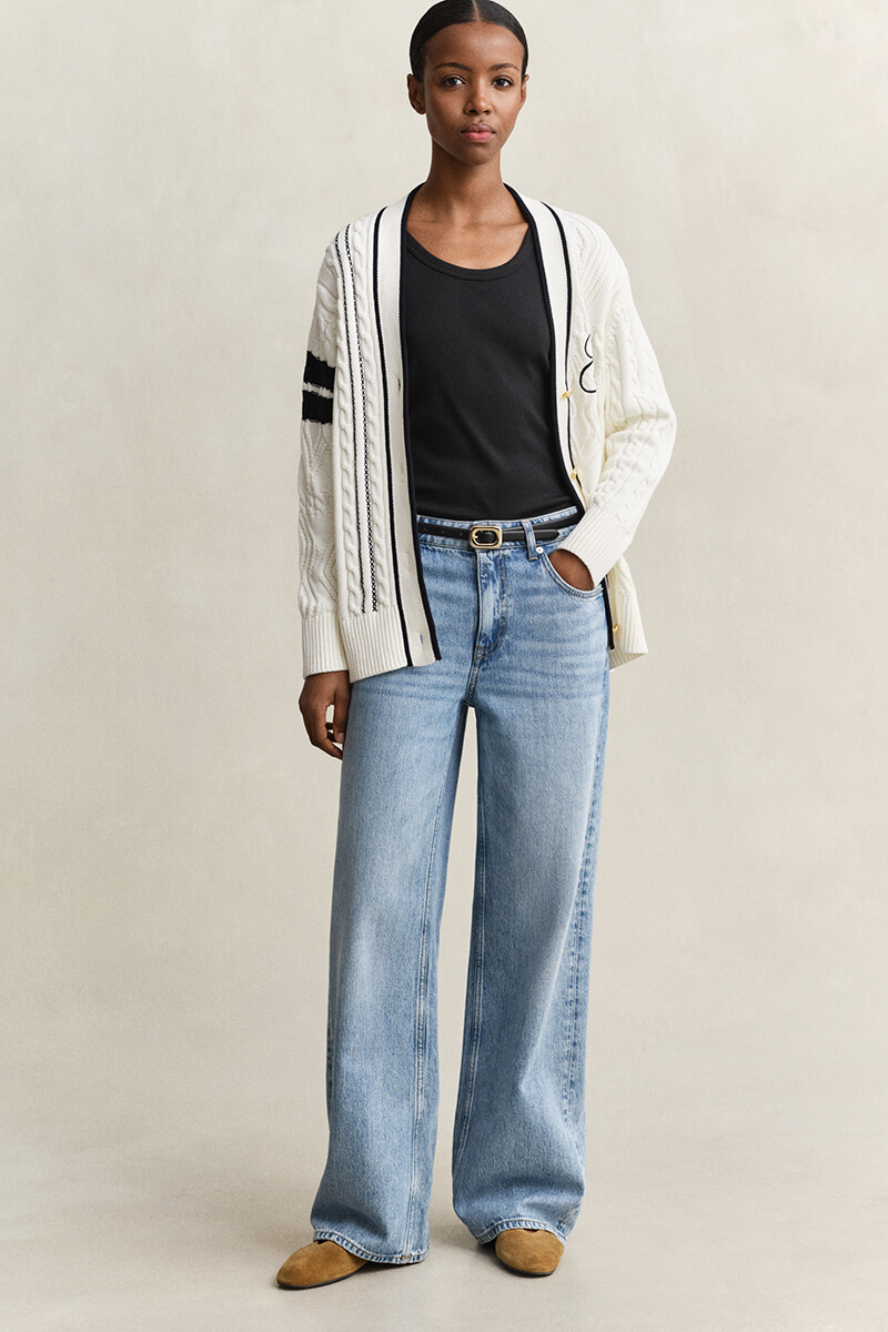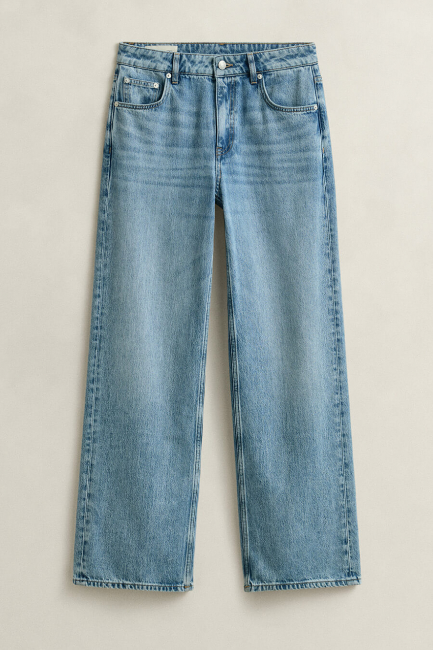 These Gant jeans, crafted from a blend of certified recycled cotton and lyocell, offer a relaxed fit.Featuring a mid-indigo wash with expressive details, they sit comfortably at the waist, fit slim over the hips, and have a straight leg cut. The design is completed with a fly front opening and distinctive branding on the buttons, rivets, and back waistband label.