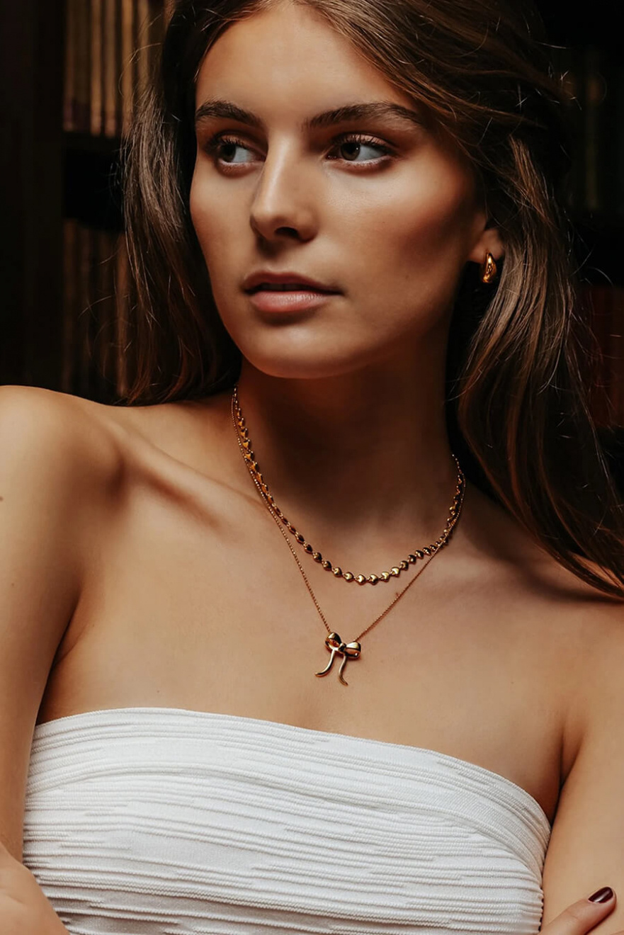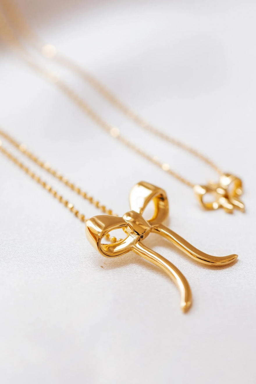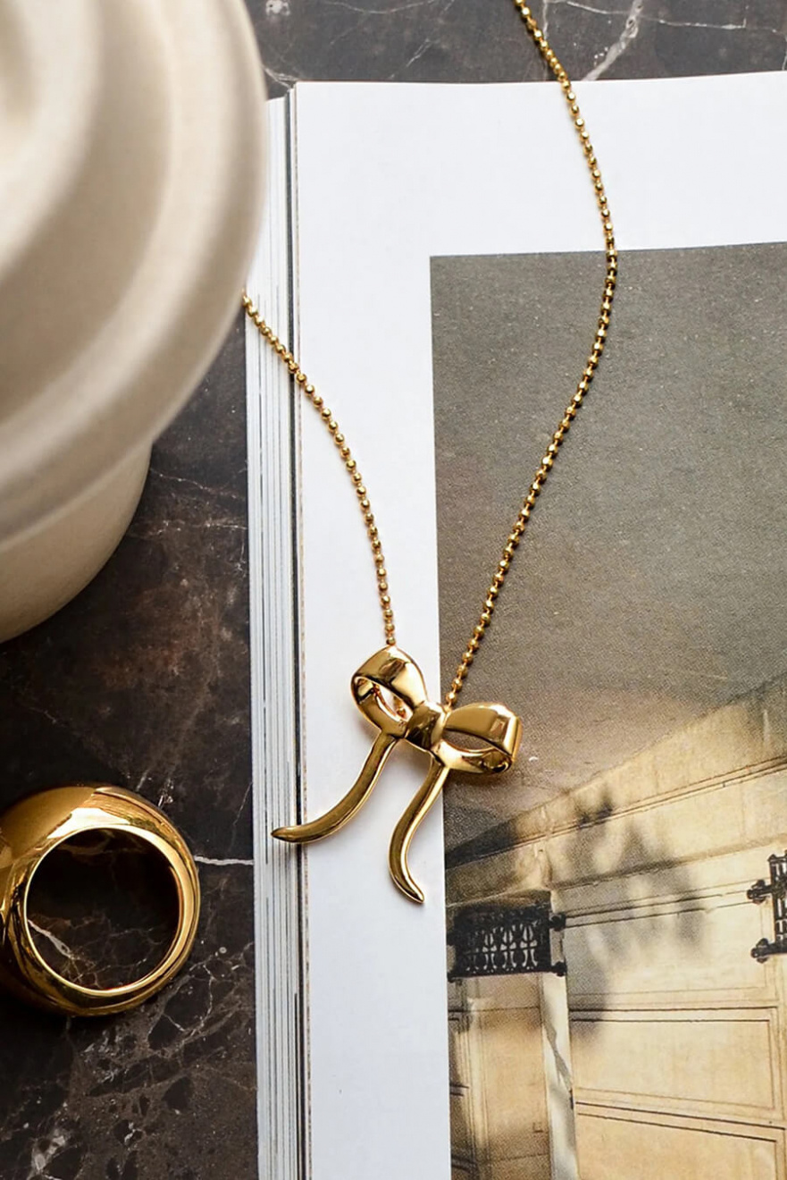 The necklace features a big bow pendant and a structured, sparkling chain that really catches the light. If you're looking for the perfect statement necklace to elevate your look, you've found it!