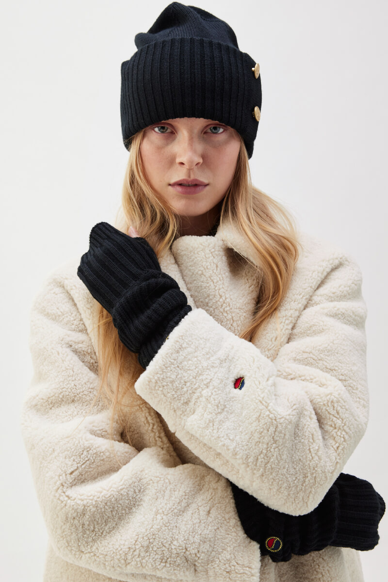 Black knitted hat with a turned-up brim and two decorative buttons at the front. Perfect with a long wool coat and knitted scarf for an elegant winter look, or with a parka and boots for a casual style. A detailed accessory that elevates a cold season outfit.Knitted beanie in a soft merino wool with fold up edge and decorative buttons front from Busnel.