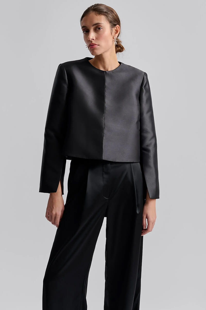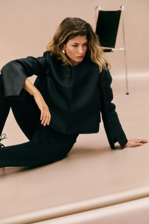 You will use this slightly shorter blouse jacket combined with a nice skirt or wide trousers for all dinners, parties or just after work with nice jeans.Long-sleeved blouse / small jacket with slit details on the sleeves, buttoned at the front with trousers.