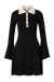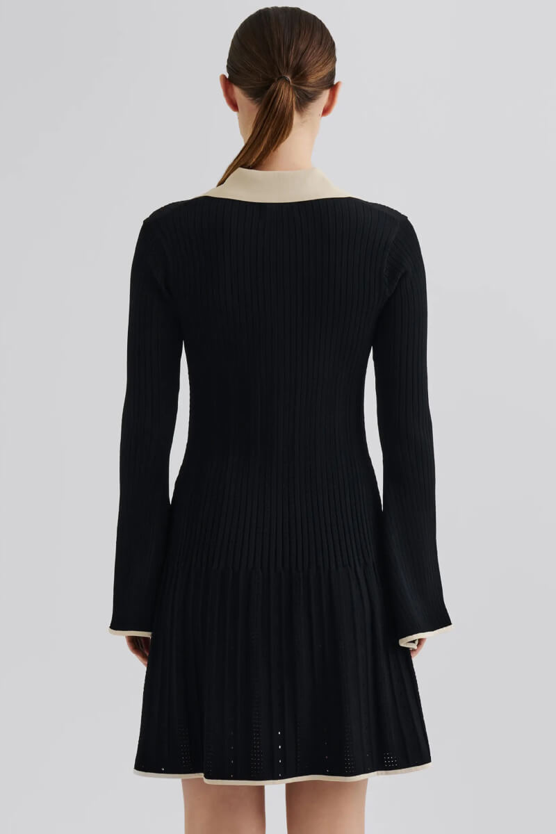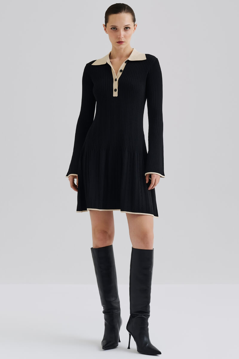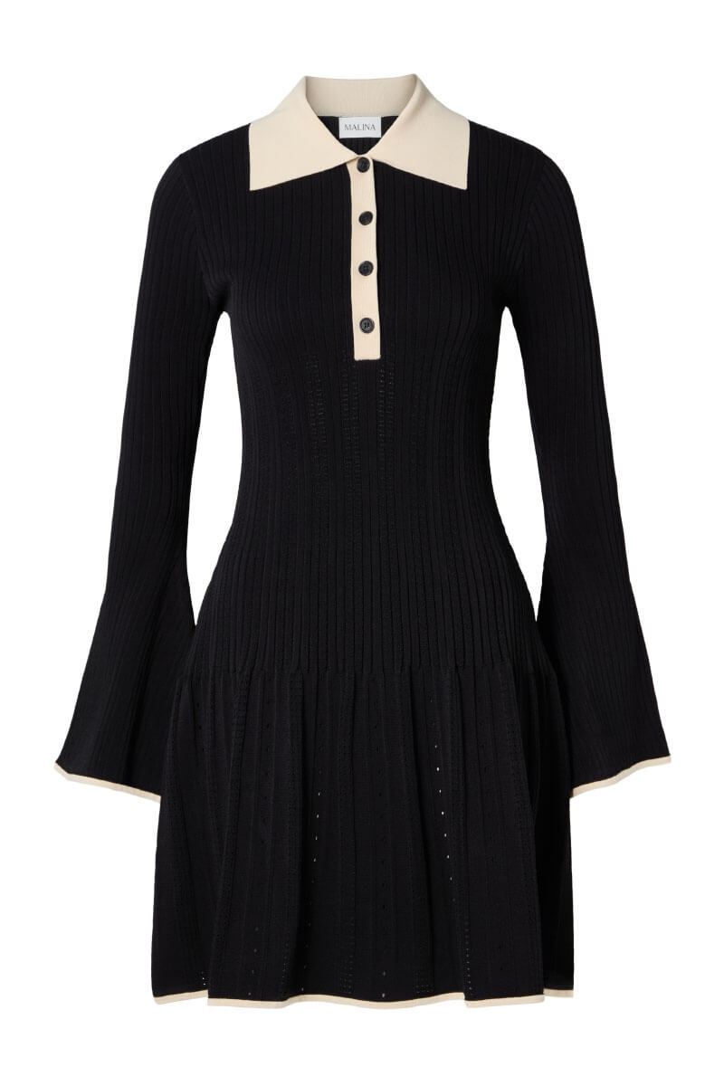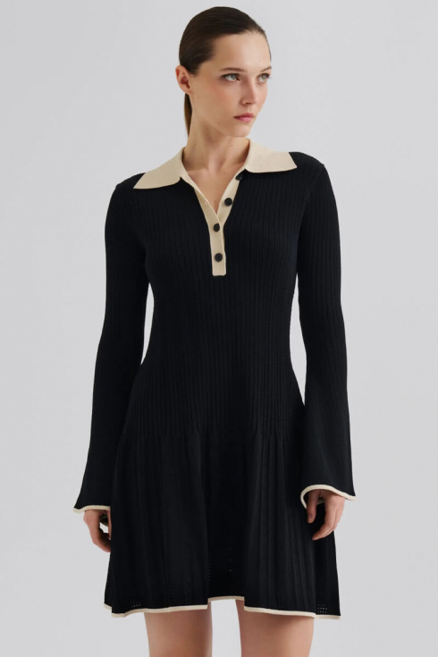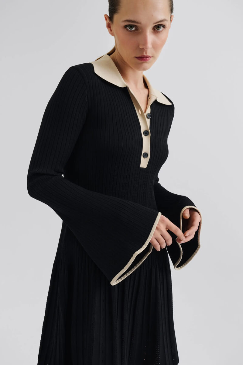 Black knit dress with white contrast trim - a sharp silhouette with a slim fit, bell skirt and wide sleeves. Style with kitten heels for a chic evening look or with loafers for a daytime style with edge.Ribbed dress in a viscose blend with wide sleeves, collar, button closure at the front and contrast colored edges from Malina.