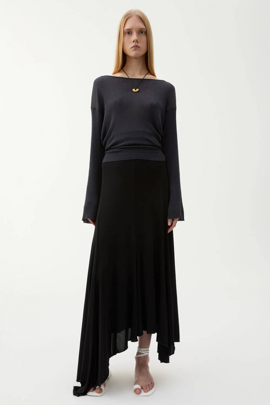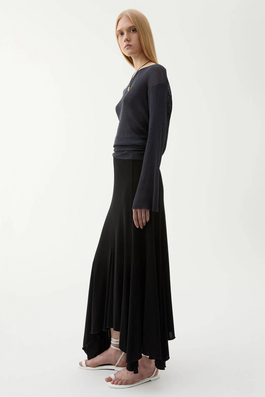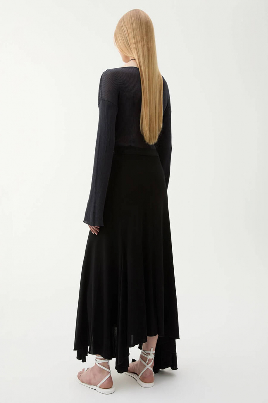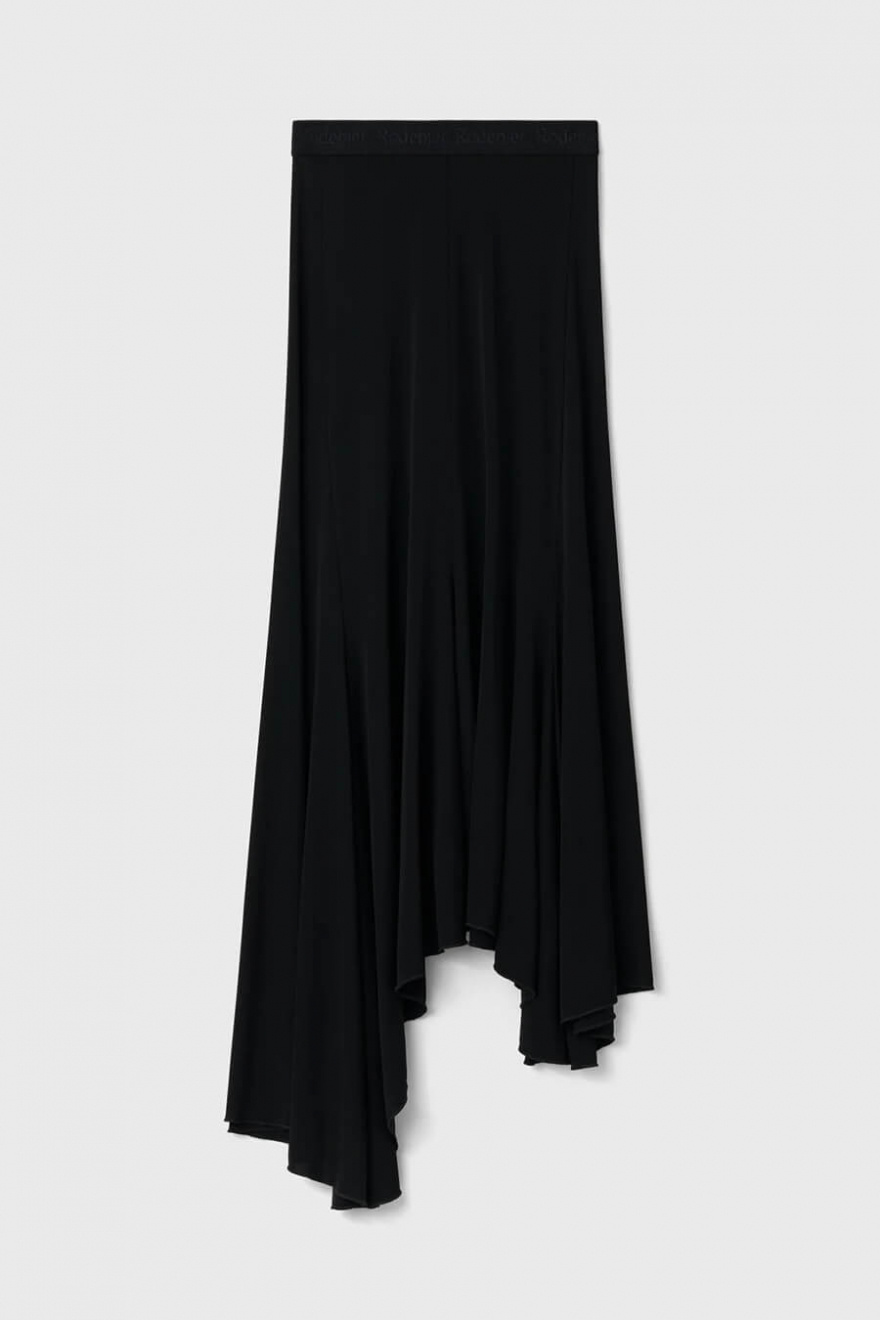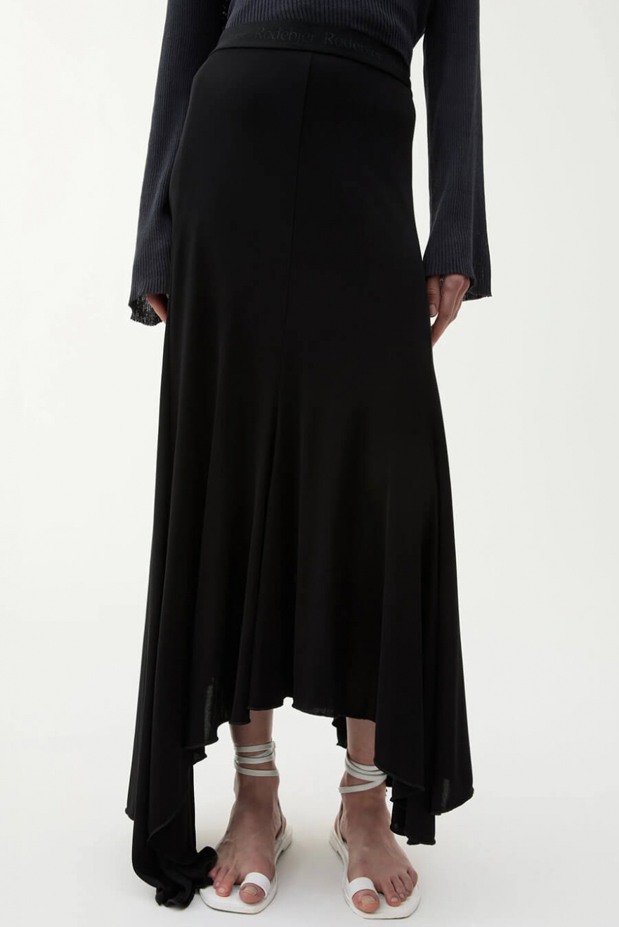 A black viscose skirt that moves elegantly with every step. Its asymmetrical hem and soft, flowing material create a dramatic yet simple silhouette. Perfect to wear with everything from knits to tailored shirts for a timeless look.Asymetric skirt in viscose with A-shape, elastic waistband with logo from Rodebjer.