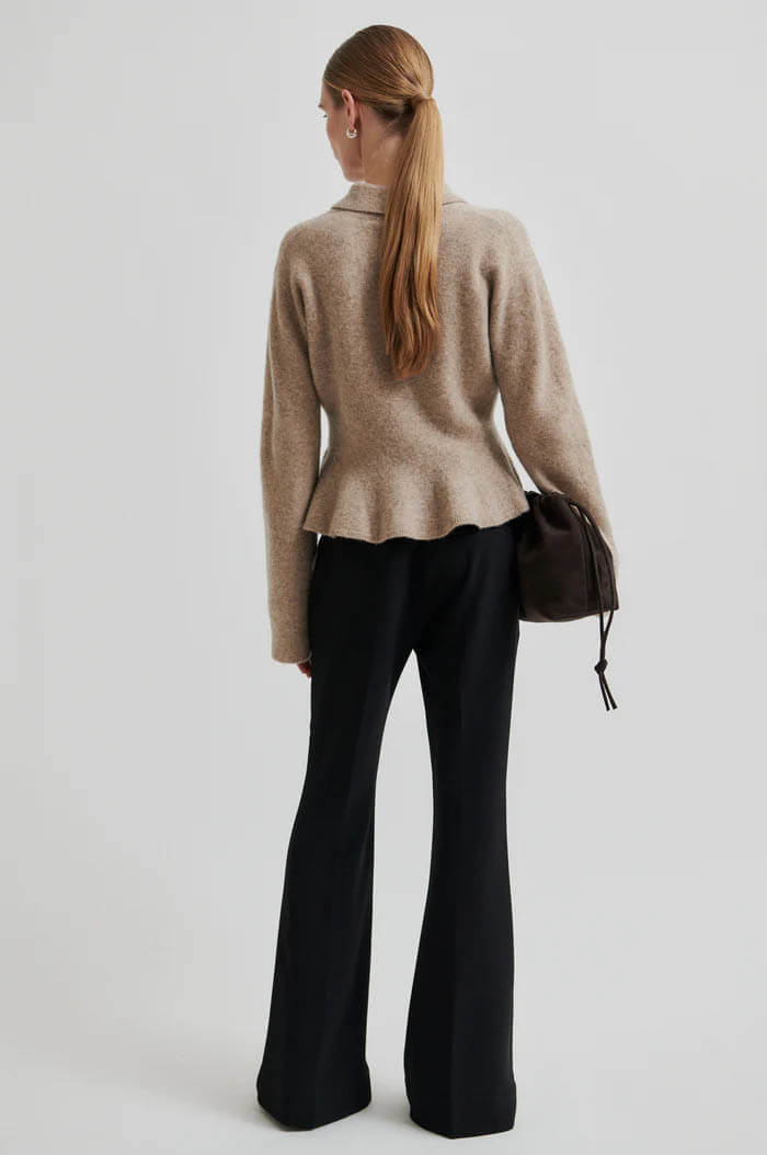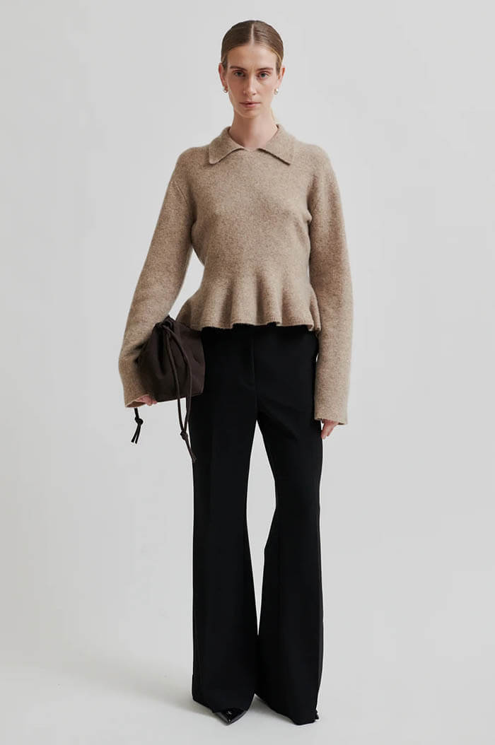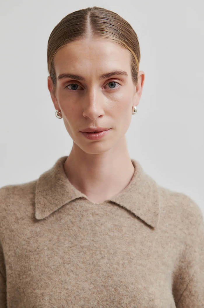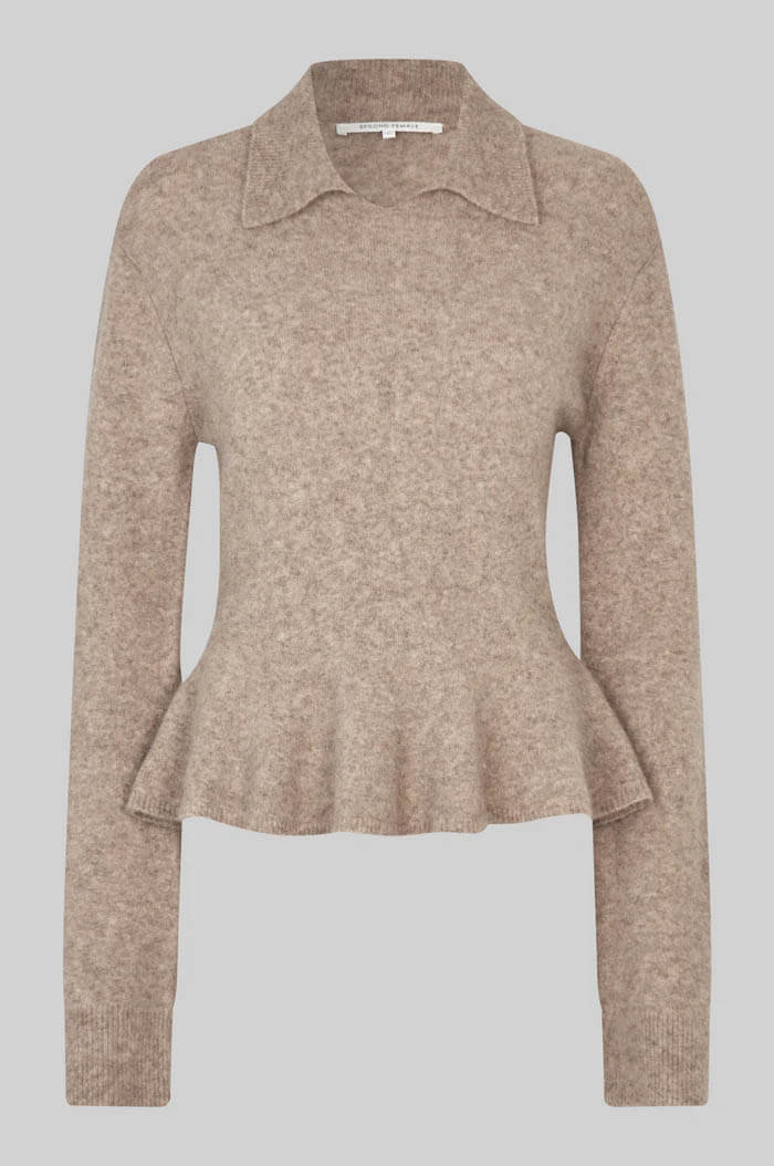 Second Female lovely pullover with collar. Made in soft and stretchy wool blend with fluffy texture. Featuring a ribbed collar and long sleeves. Ribbed hem at cuffs and bottom hem.Regular fit with slight frill at bottom hem.