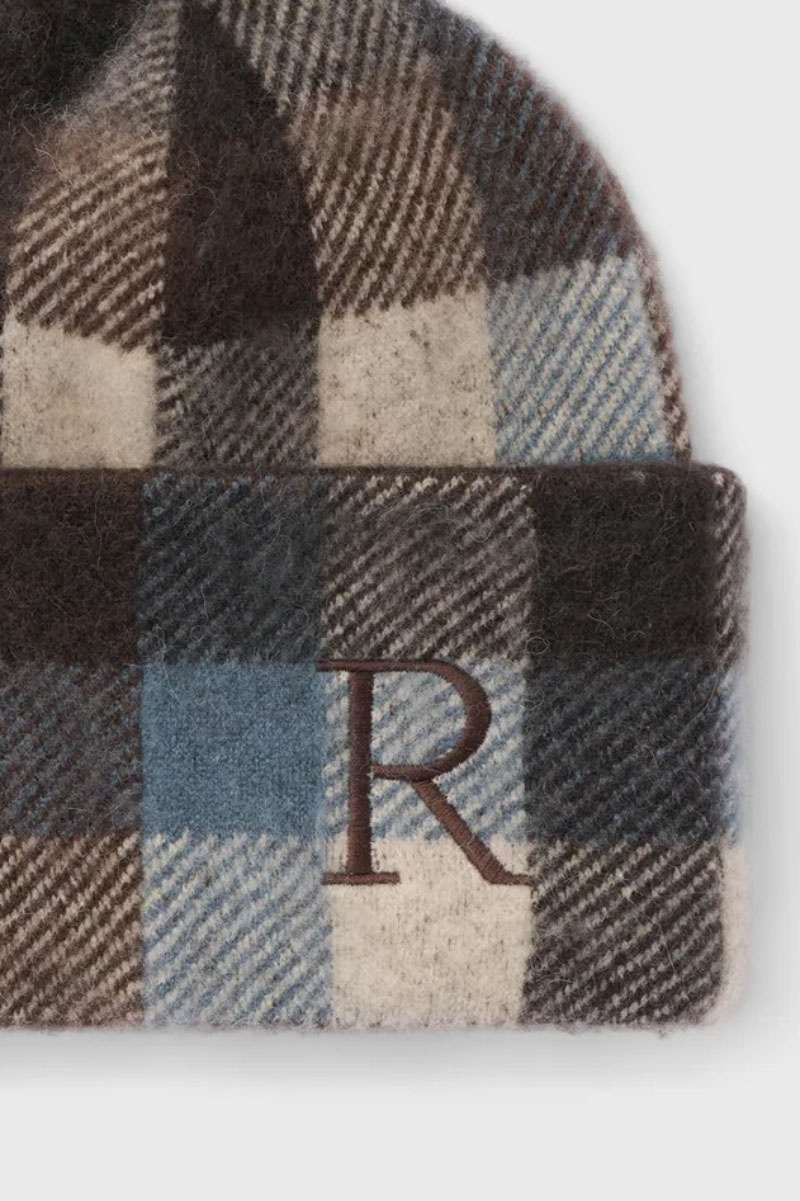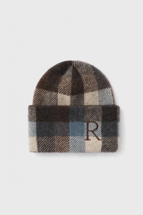 A checkered knitted hat in a soft alpaca blend with a turned-up brim adds warmth and character. Match with an oversized coat, knitted scarf and boots for a modern winter look that combines function, texture and casual elegance.Knitted beanie in a soft woolblend with fold up edge and embroidered R front from Rodebjer.