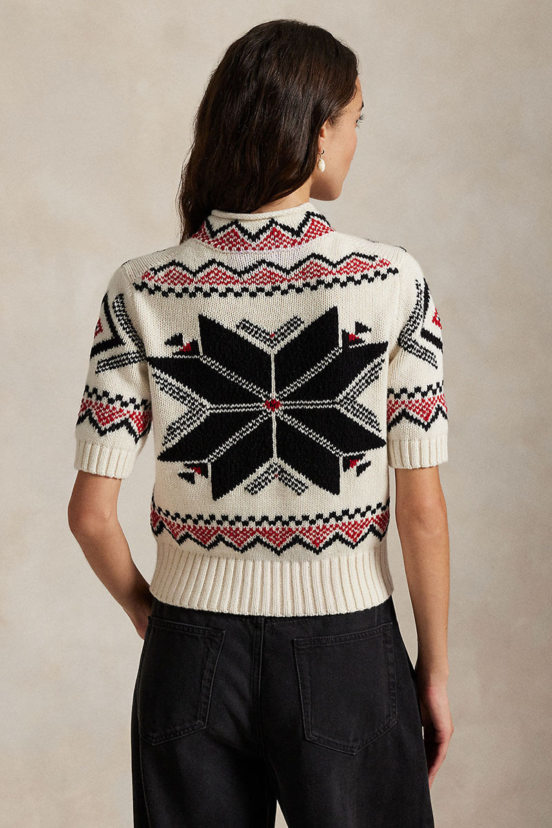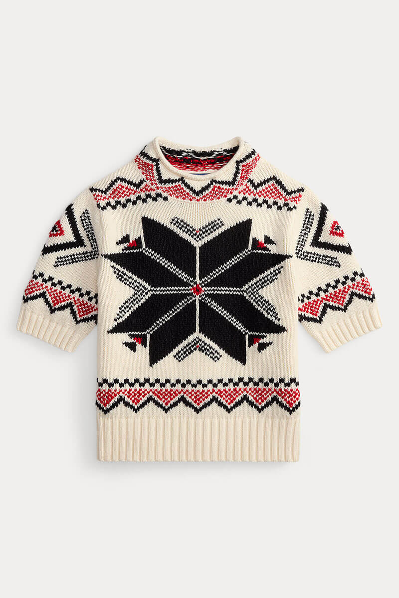 One of the most beautiful knitted top for winter. Sylt with long skirt or creme trouser for a chich look. Ready for both family dinner as Holiday.Wool and cotton yarns lend a soft hand to this short-sleeve mockneck jumper, which features an intarsia-knit snowflake motif and is framed by jacquard-knit geometric borders.