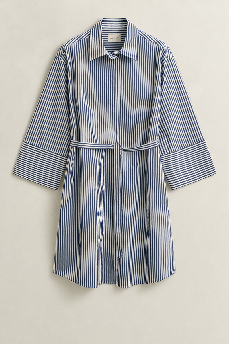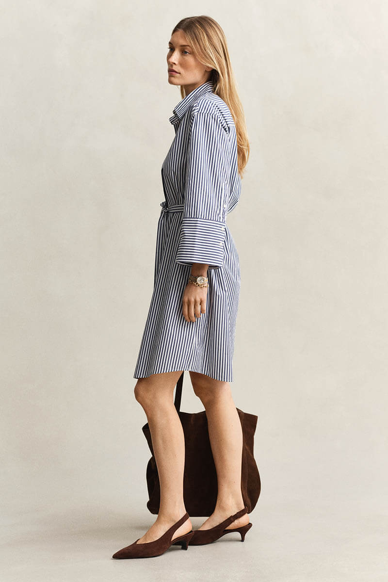 A timeless shirt dress in crisp cotton poplin, merging classic style with modern comfort. The striped design and relaxed silhouette make it a versatile staple for a polished everyday look, with or without the waist belt.