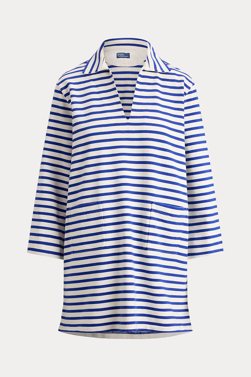 This nautical-inspired dress is cut from heavyweight cotton jersey fabric featuring contrast yarn-dyed stripes. The casual, relaxed silhouette has a pointed V-notch collar and two front patch pockets.100%bomull