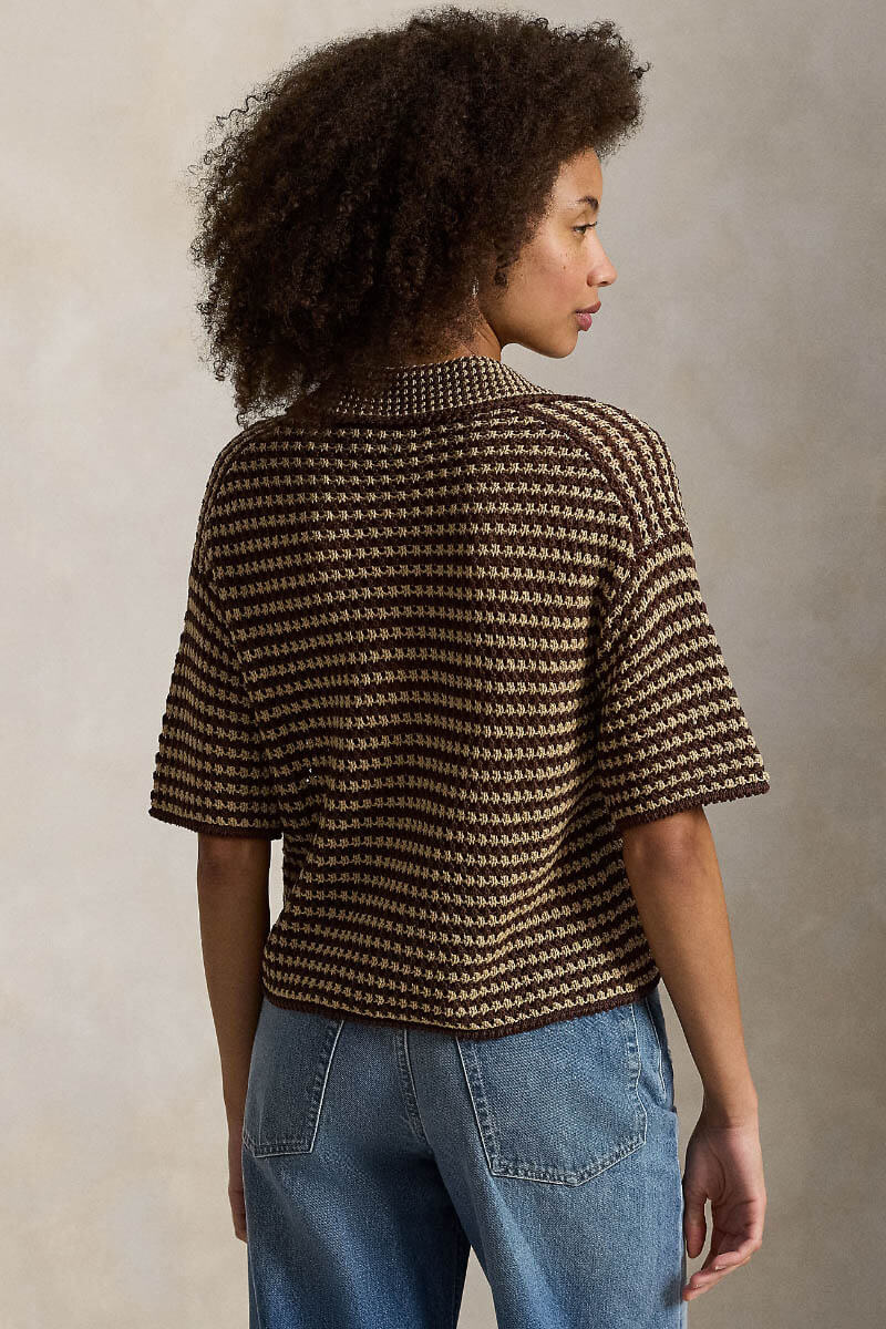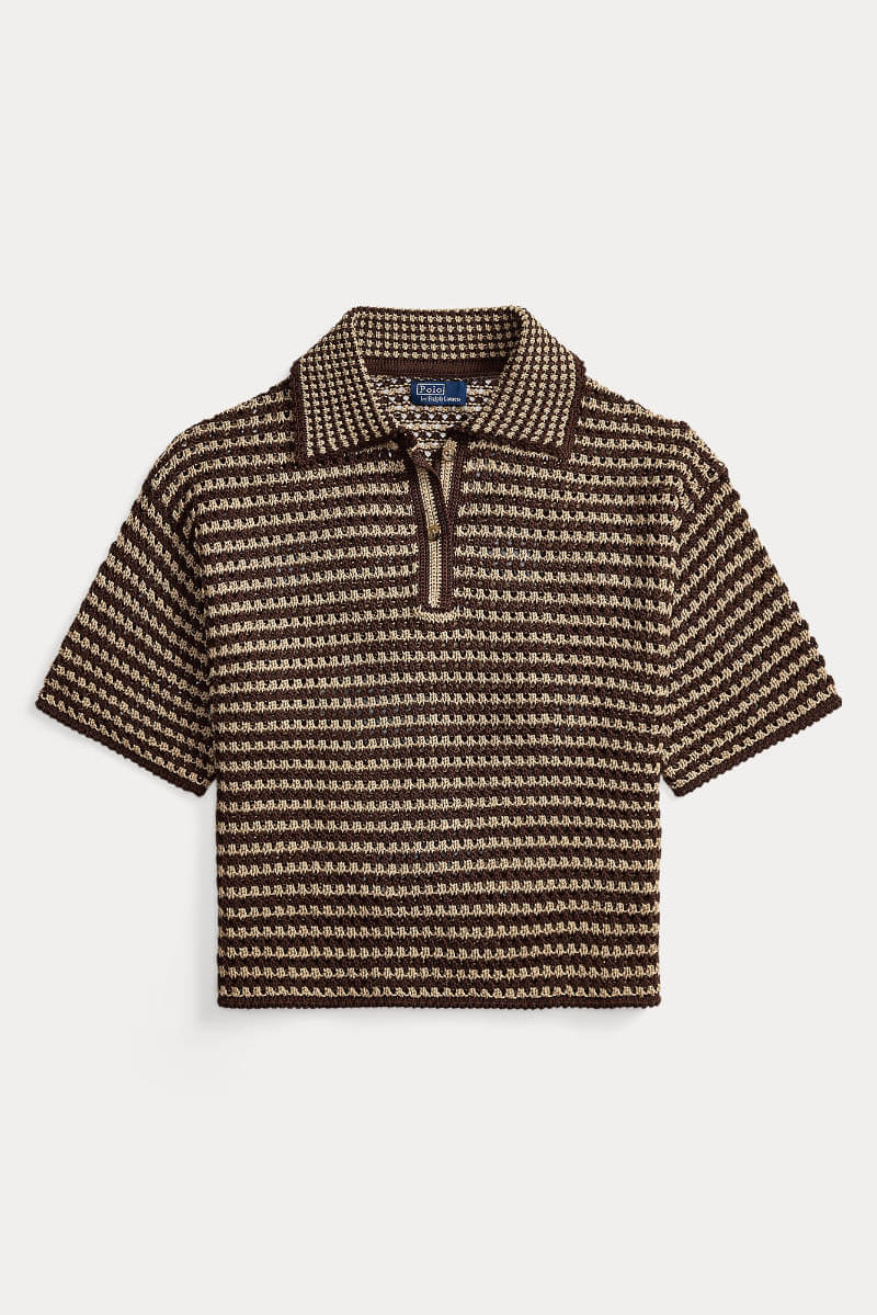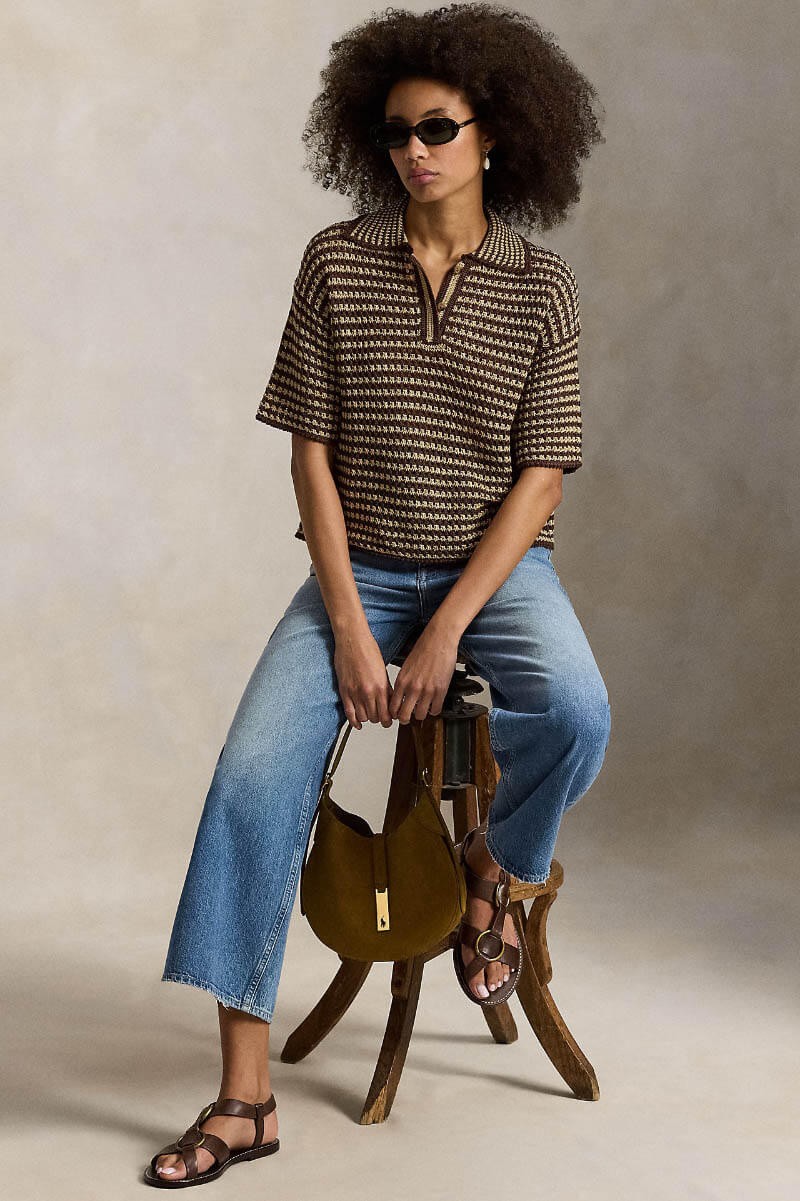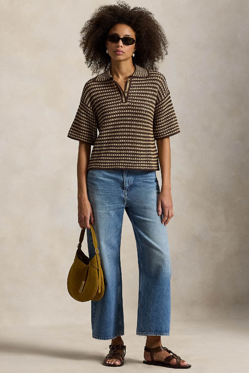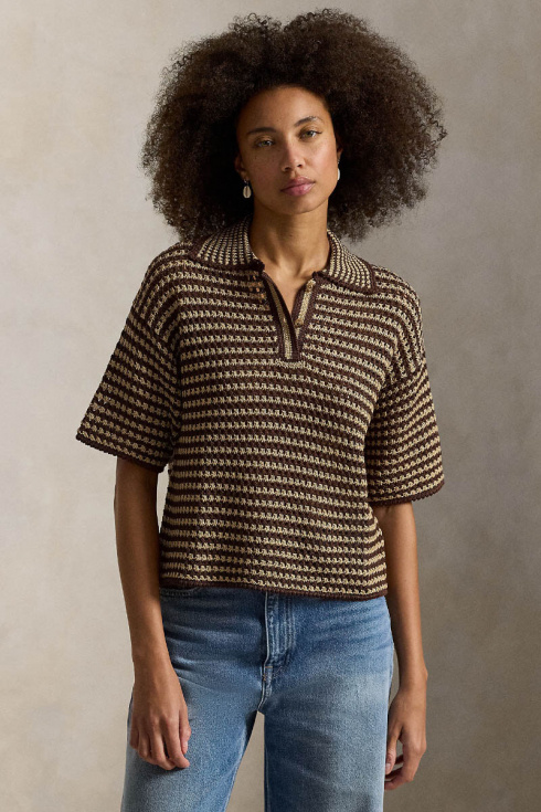 A modern and feminine top inspired by the classic polo shirt. The open-knit structure and crocheted details create an elegant look, while the relaxed, slightly cropped fit gives it a light and refined silhouette. Style it with a thin turtleneck and jeans for a modern everyday outfit.