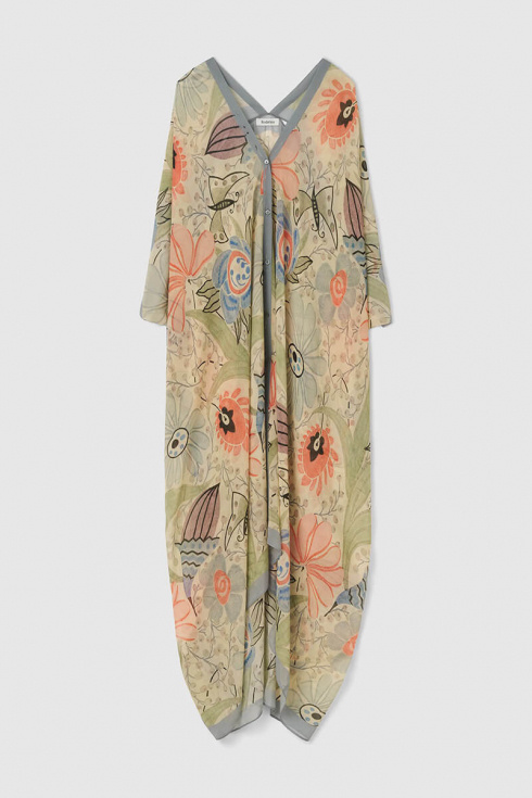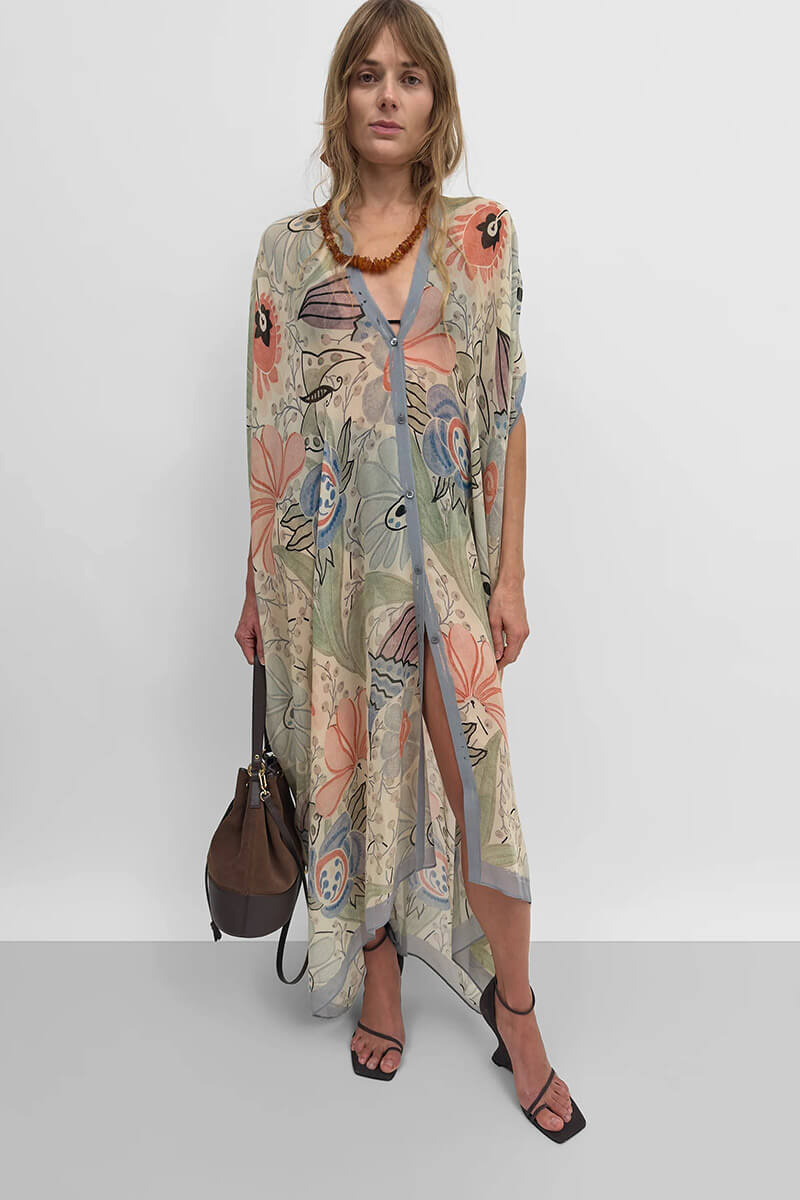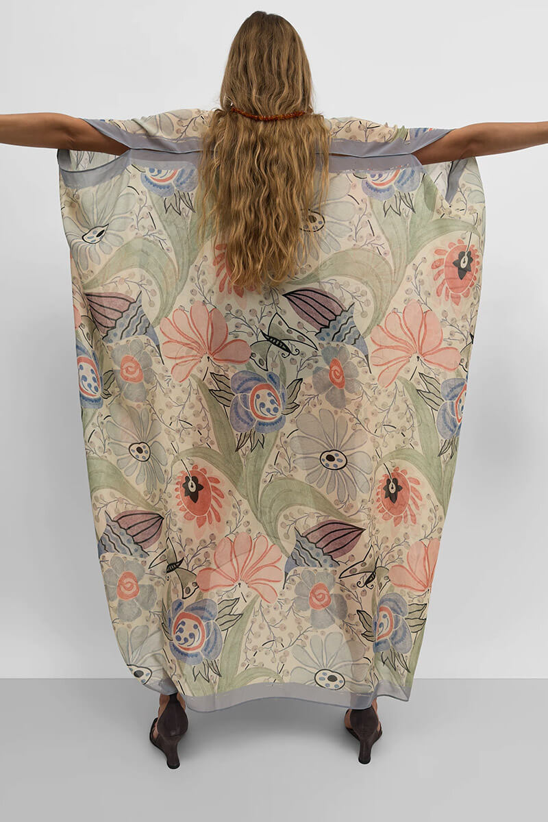 Versatile Caftan – can be worn as a dress, folded into an oversized scarf, or wrapped as a pareo. It easily folds into a compact square that takes up no space in your bag. Featuring a V-neckline at the front and decorative back details, it is crafted from a single piece of fabric for an elegant and fluid fit.