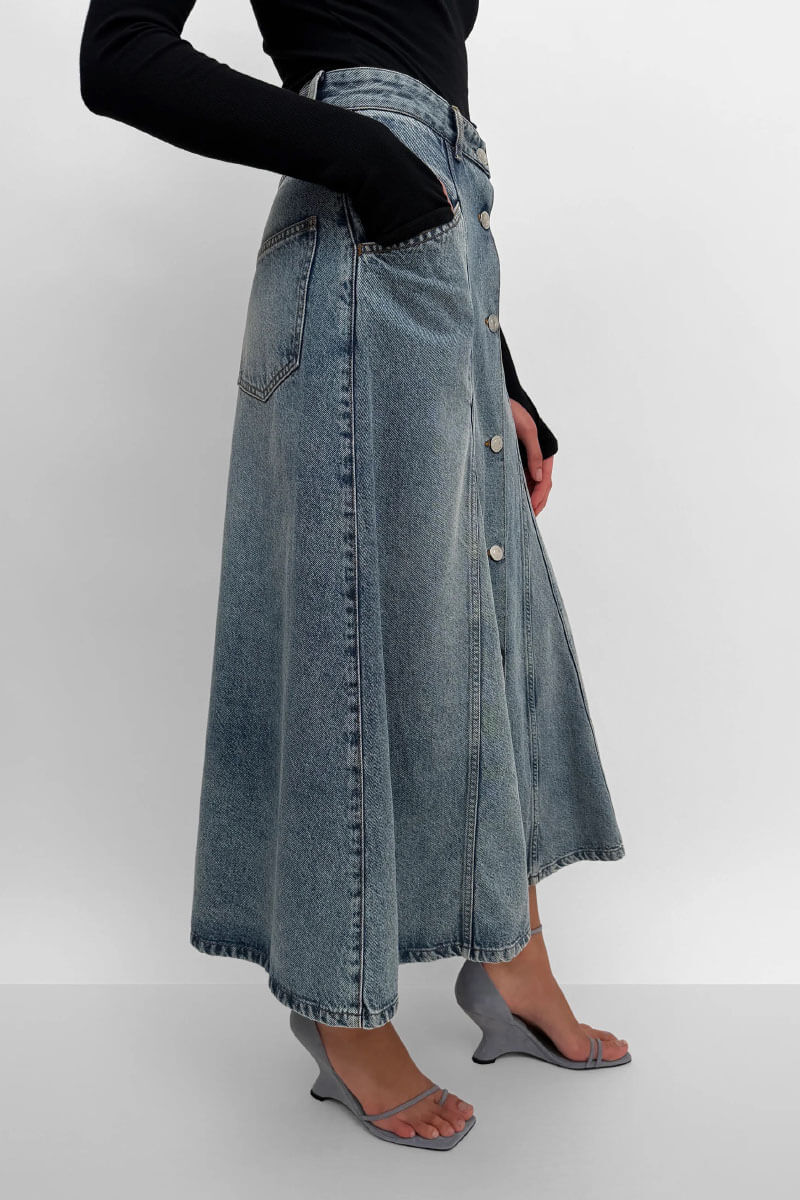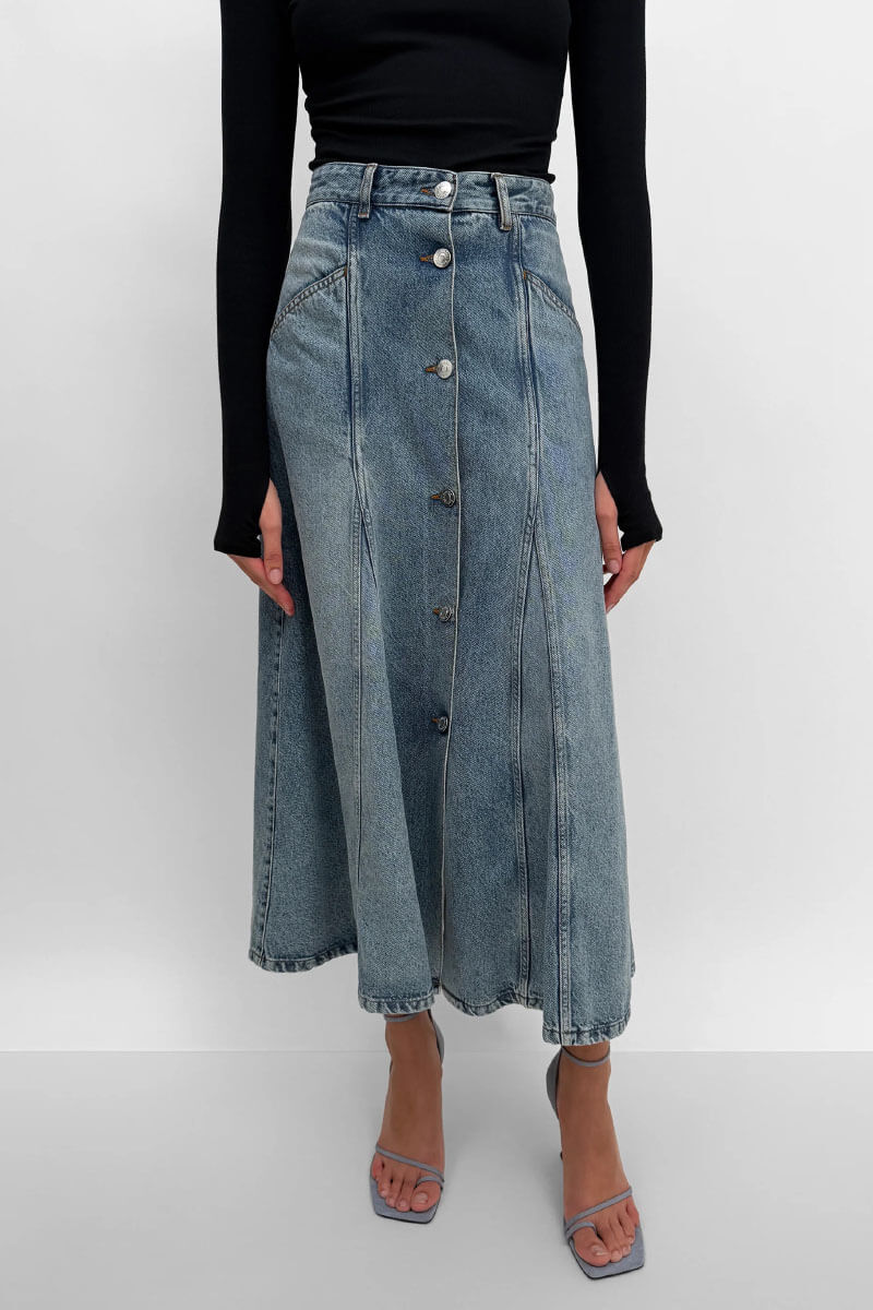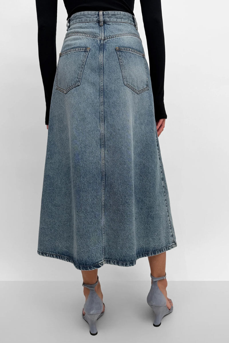 Mid-calf denim skirt featuring a mid-rise waist, classic five pockets, and decorative v-inserts. The skirt has a timeless design and features a button closure along the front.