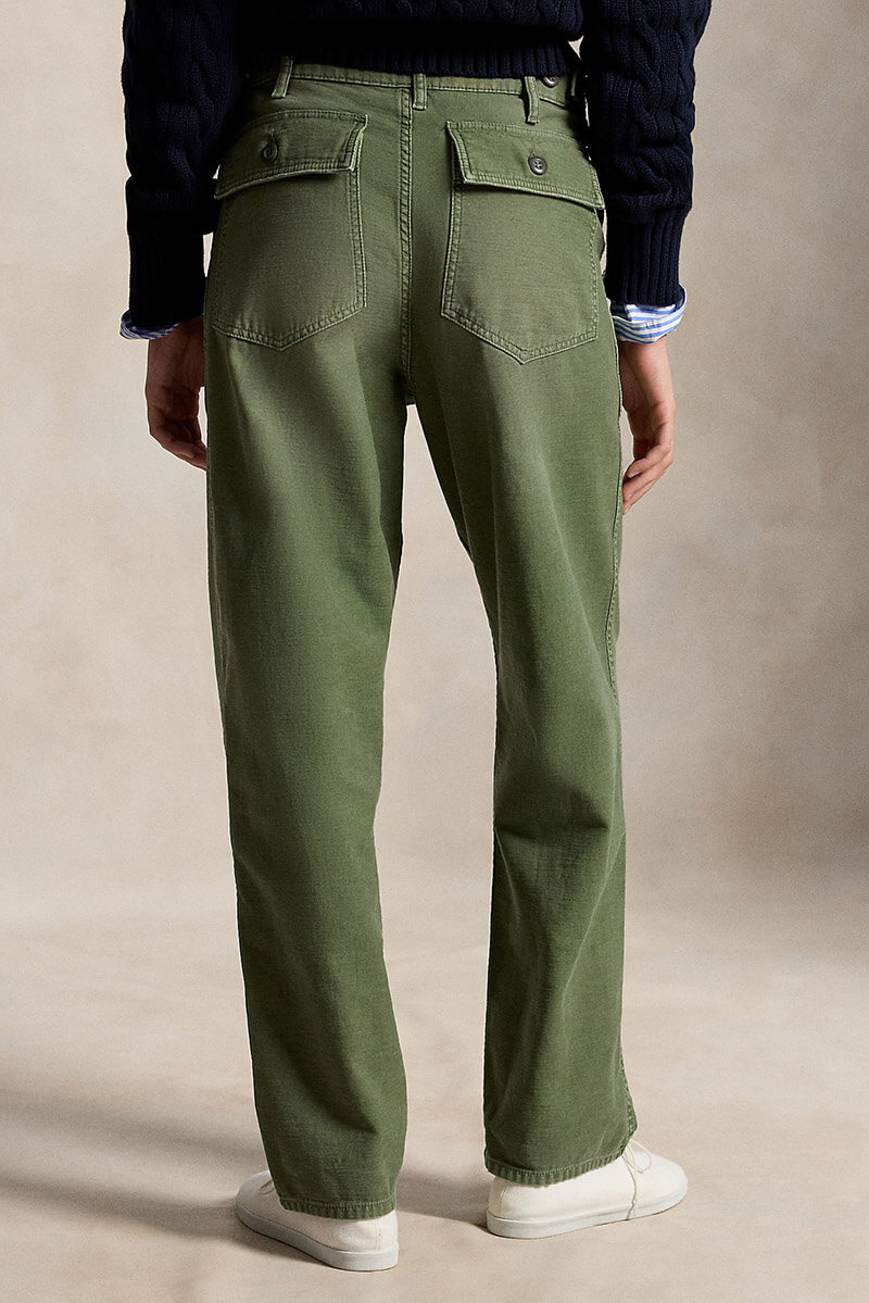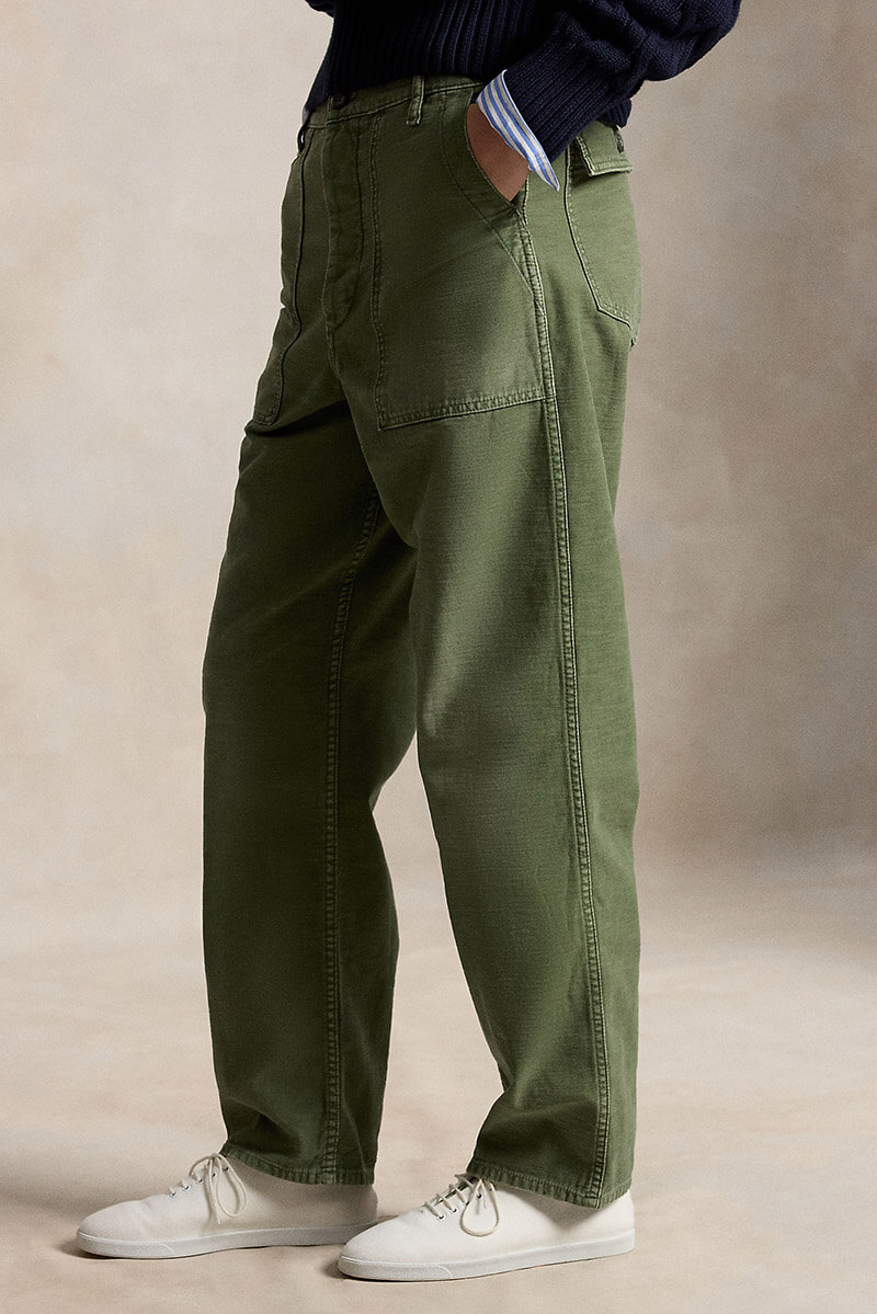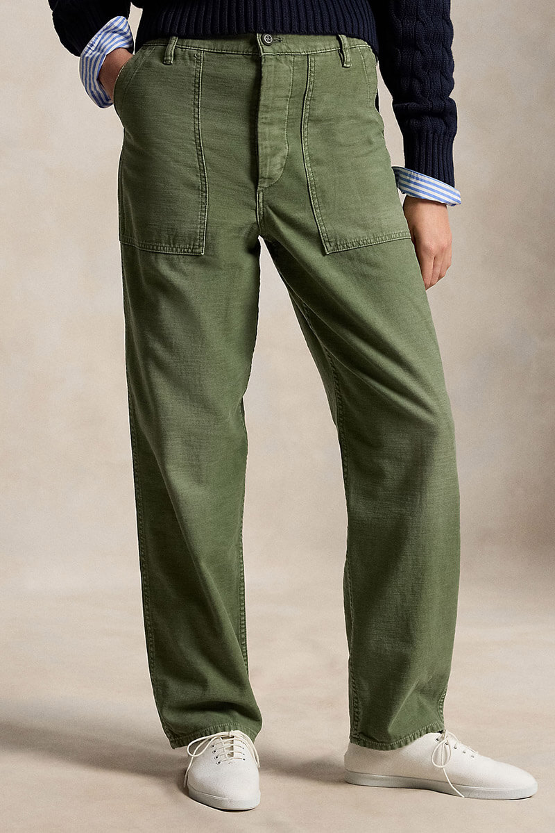 This style features adjustable buttoned tabs at the waist for a personalized fit, along with utility inspired pocketing that adds a modern, functional edge. Each pair is specially dyed to create unique variations in shading, giving every piece its own character and a softly worn, vintage-inspired look.