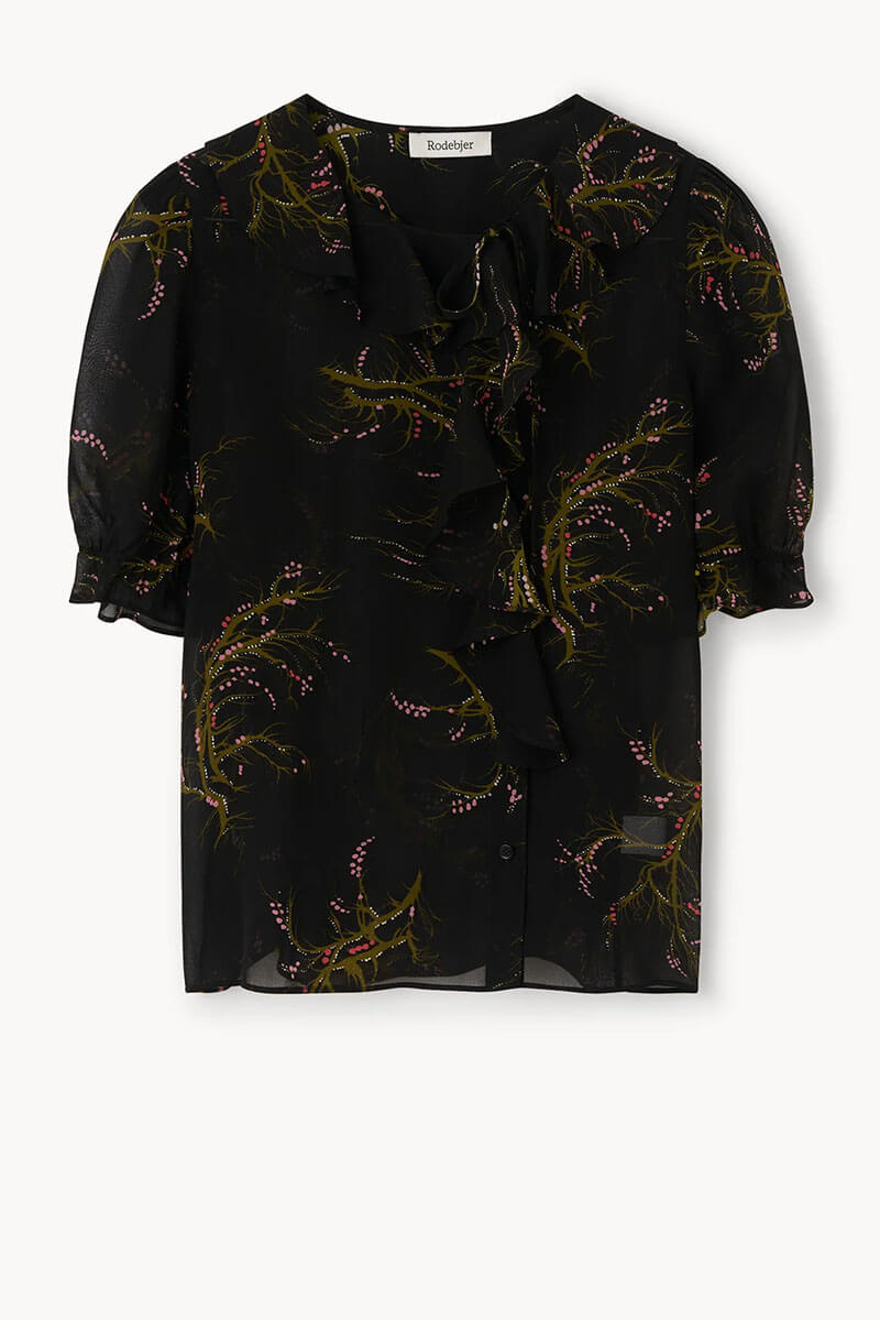 Iconic Rodebjer style in a relaxed version. Short, puff sleeve blouse with flounces along neckline and front