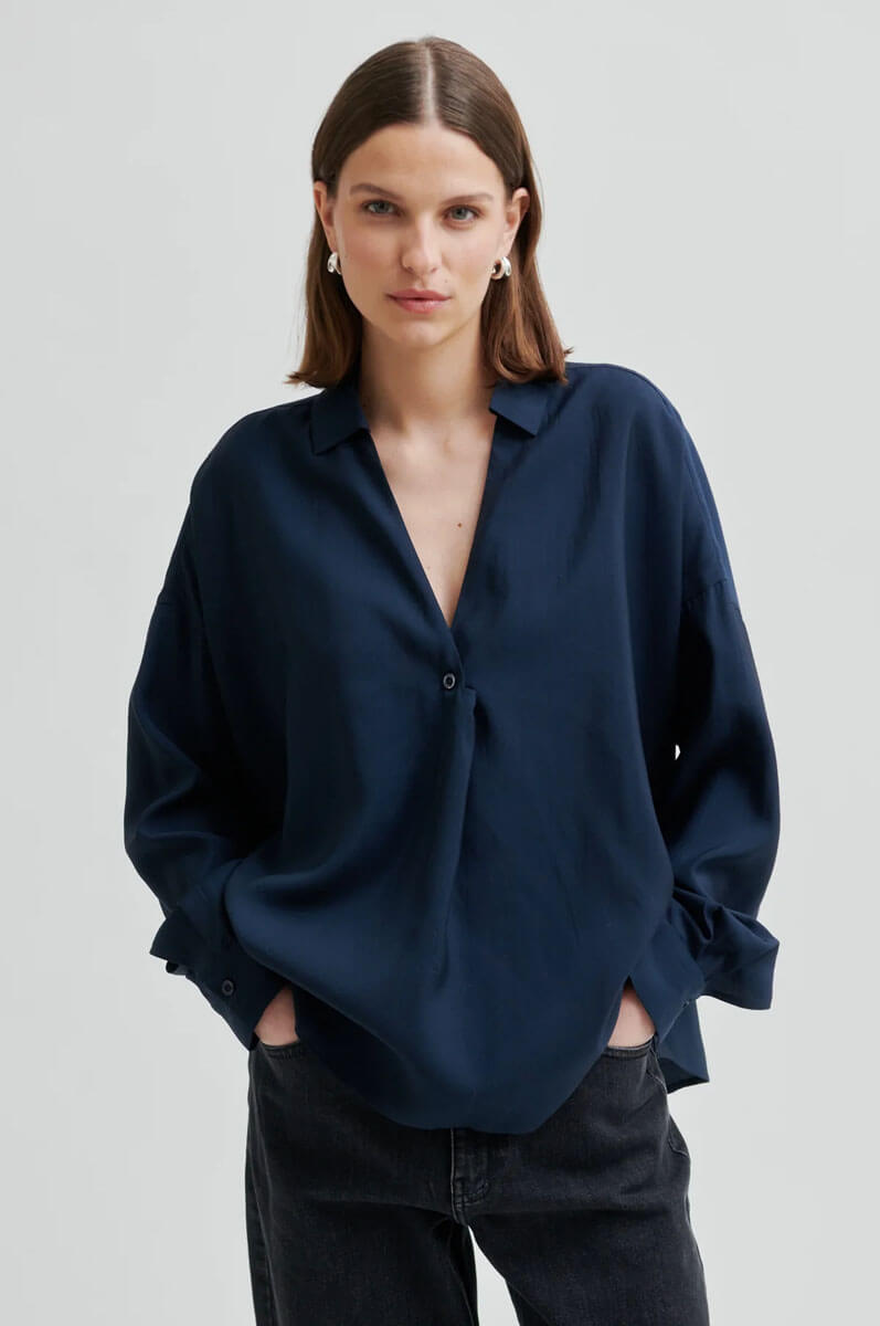 A stylish loose-fit blouse with a button detail at the front. Looks just as good tucked in as it does worn loose. The V-neckline adds a feminine touch, while the fabric feels wonderfully soft.