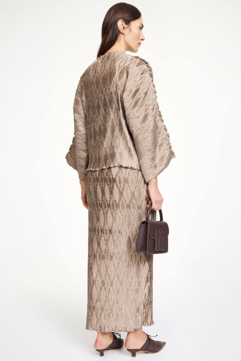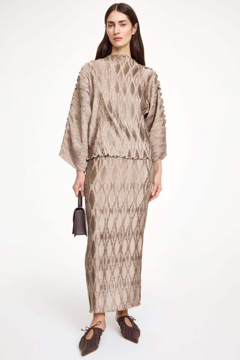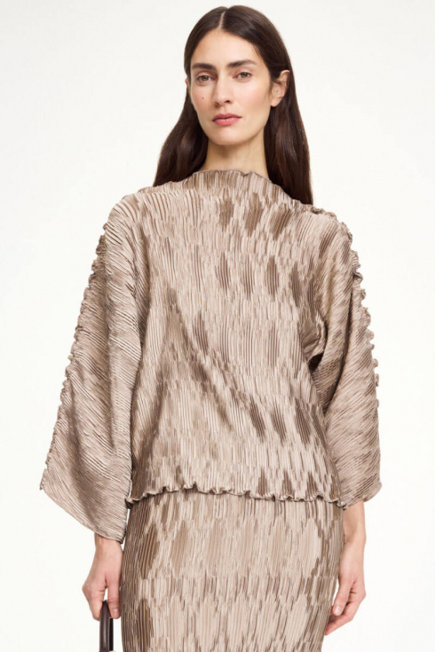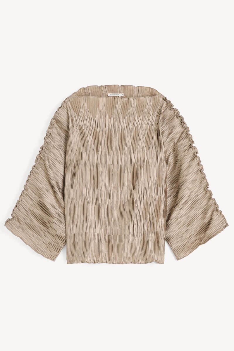 A pleated blouse in a shimmering taupe that catches the light and the eye. Style the pleated blouse with high-waisted jeans and pointed pumps for a chic contrast, or wear it with a silk skirt and loafers for the office. Add statement earrings for evening – texture meets elegance at every turn.Blouse in nicely flattering pleats with wide long sleeves, slightly short model, boat neckline and fine seams along the sleeves from By Malene Birger.