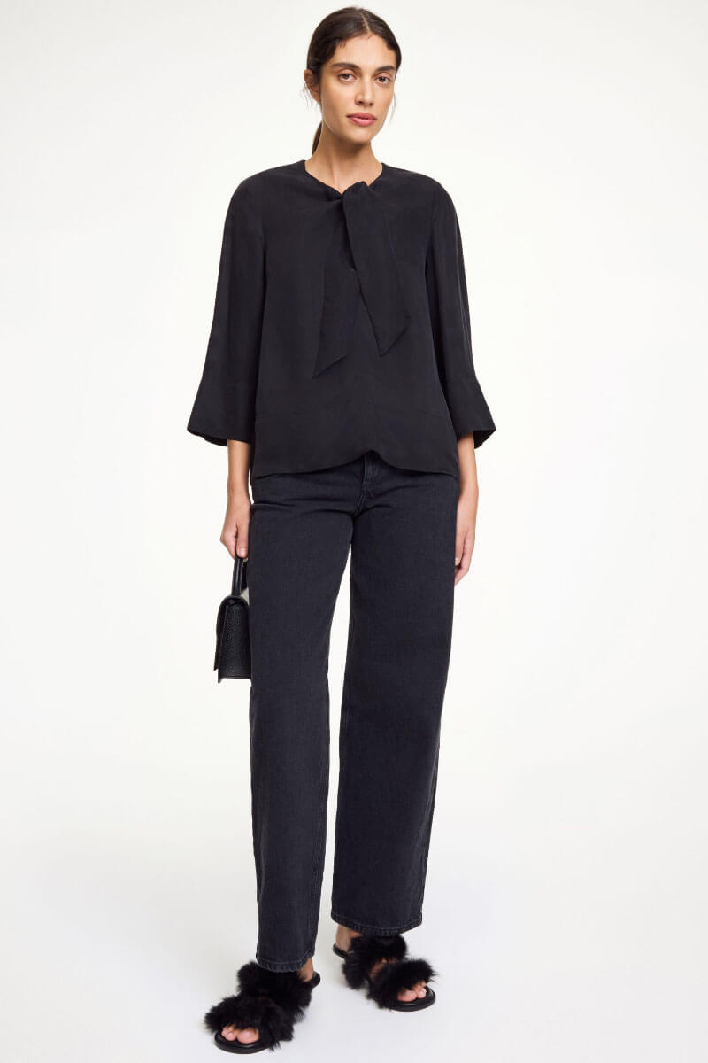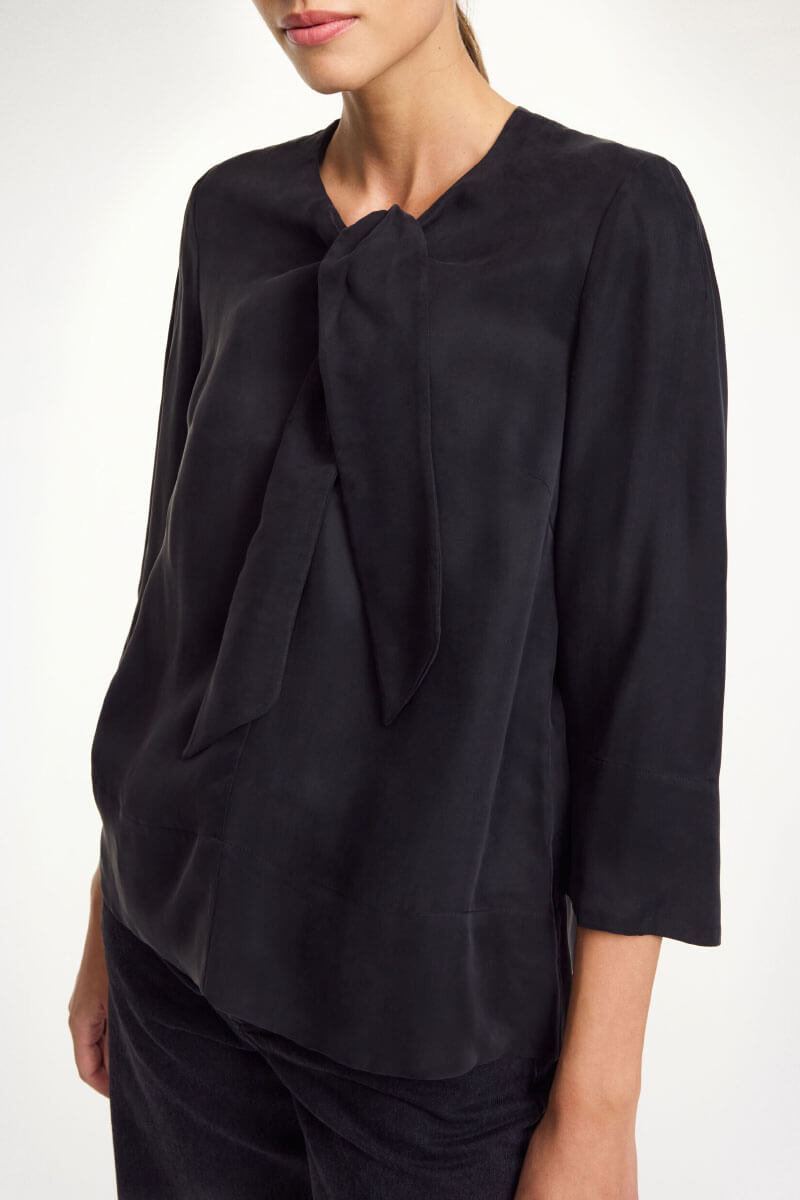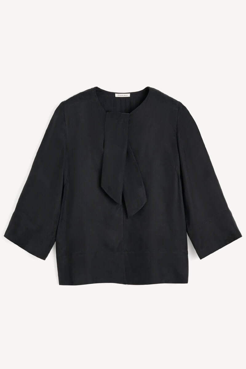 Black blouse with a tie front - perfect with suit pants and loafers for an updated everyday look. The shorter sleeves show just enough wrist and go just as well with jewelry as with red nail polish.Blouse in soft cupro blend with round neckline, tie detail front, slightly cropped long sleeves and relaxed fit from By Malene Birger.