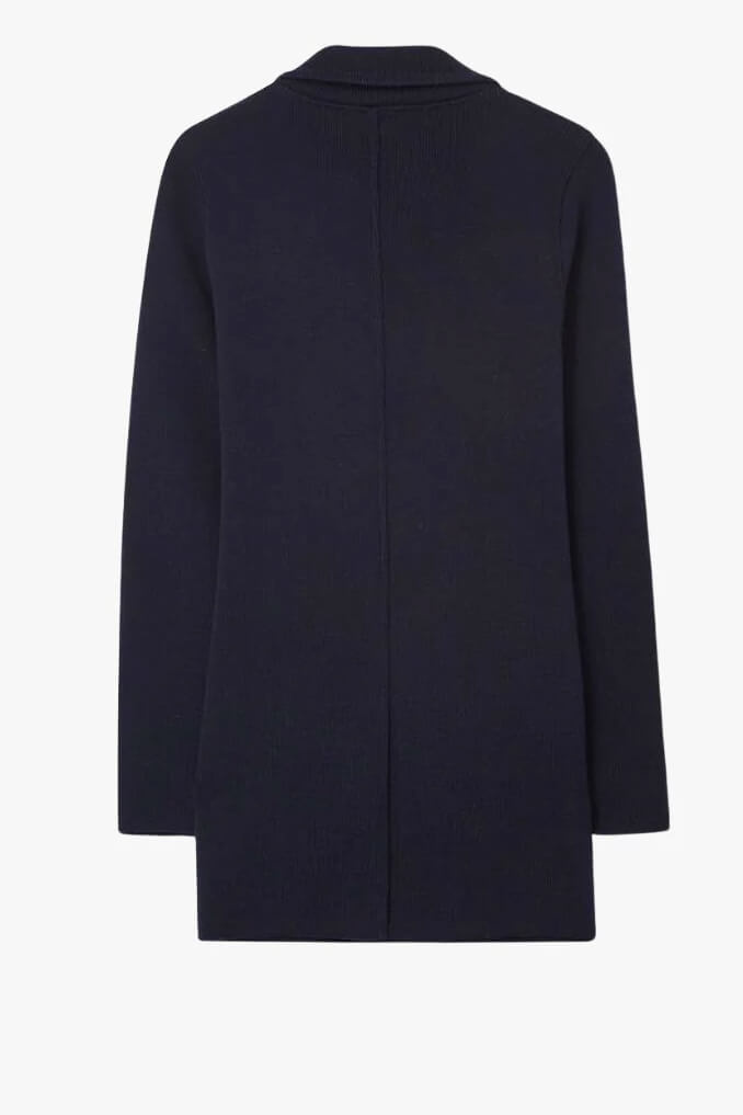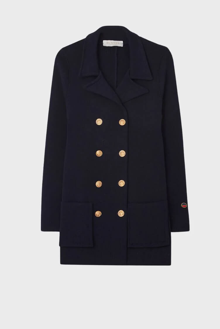 This blue knitted jacket with gold colored buttons is a timeless classic from Busnel making a comeback! The jacket combines elegance and comfort. Perfect for any occasion, it adds a luxurious touch to your outfit.Knitted jacket with collar, gold coloured signature buttons front, pockets front and small embrodidered logo front from Busnel.