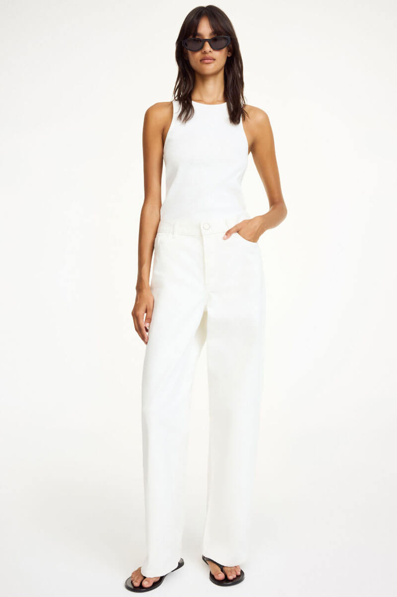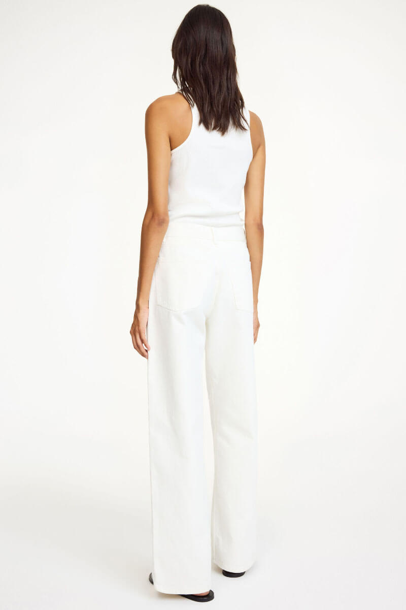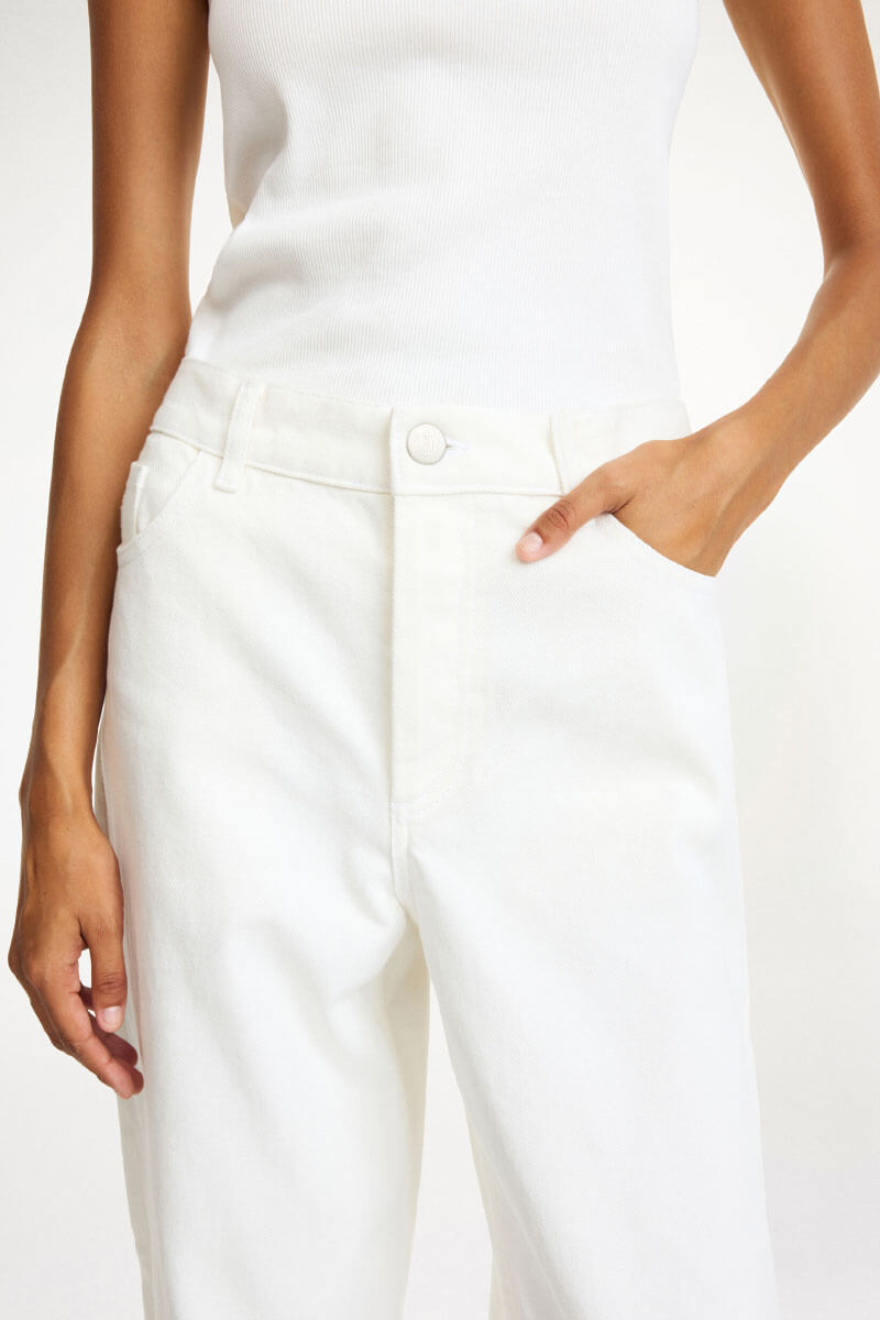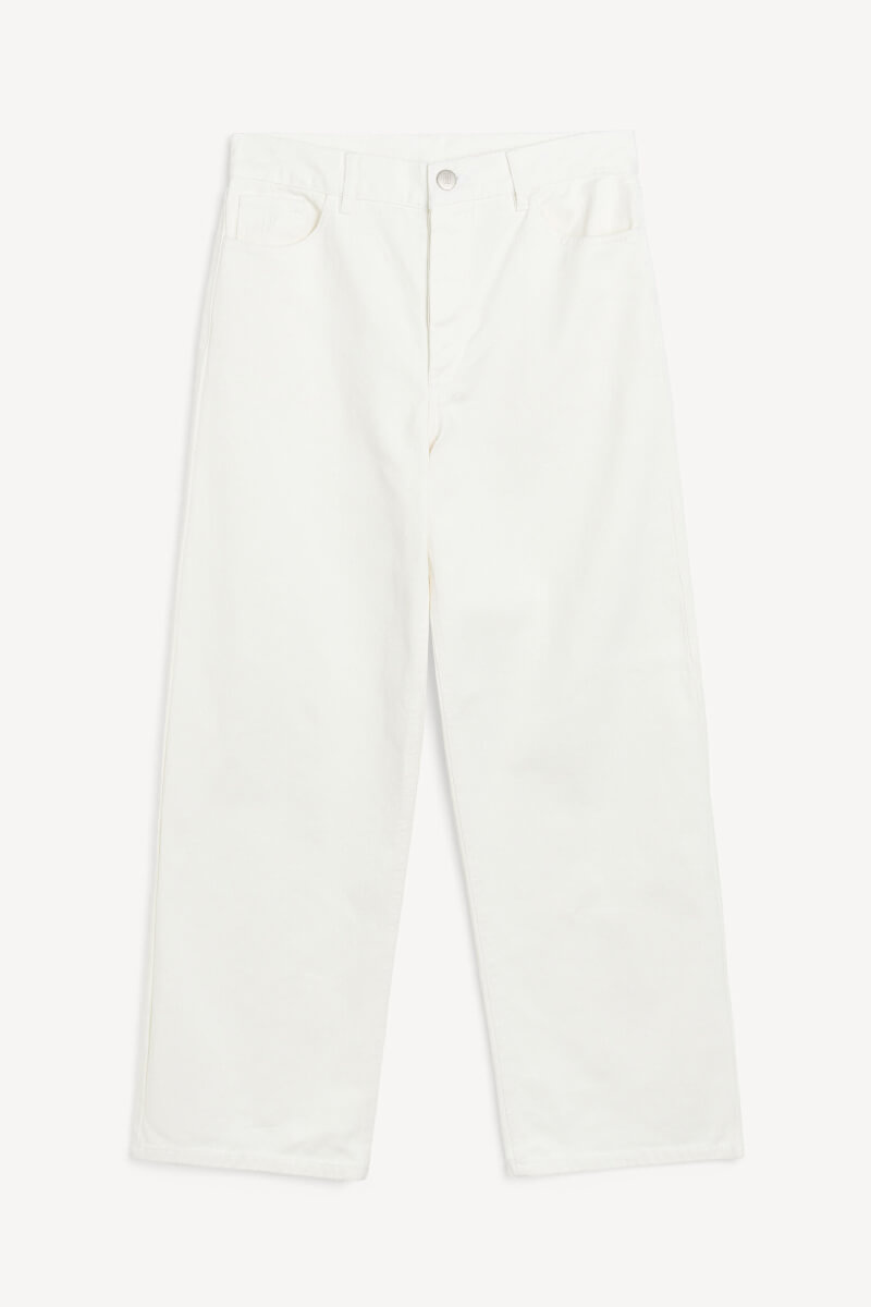 White jeans with a relaxed silhouette and subtle flare at the hem - perfect for a fresh and modern style. Wear them with a knitted sweater for a light spring look, or add jewelry and sandals for a summer evening. A timeless favorite that goes with everything.Jeans in organic cotton with slightly wide legs, medium waist, button closure at the front and loose fit from By Malene Birger.