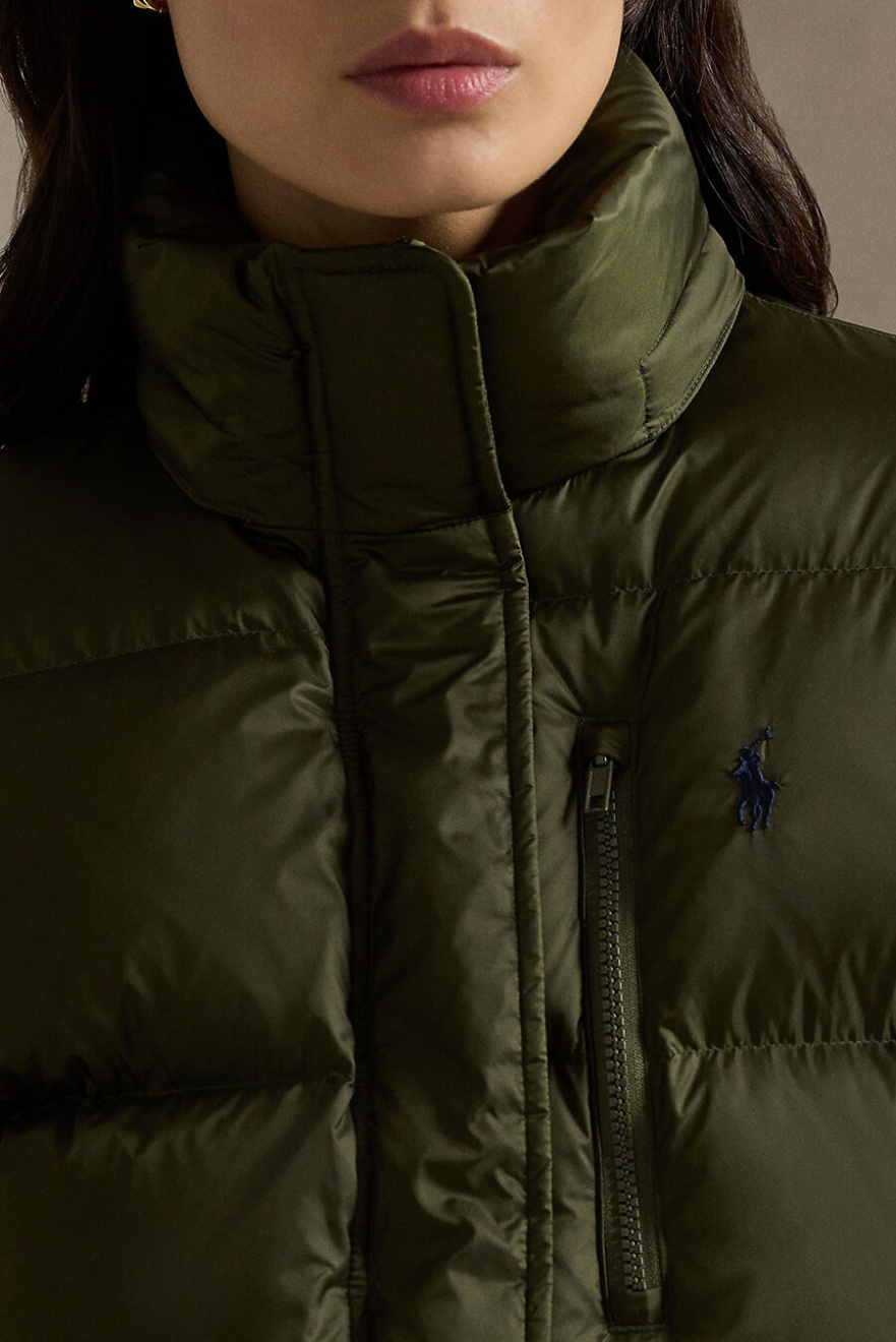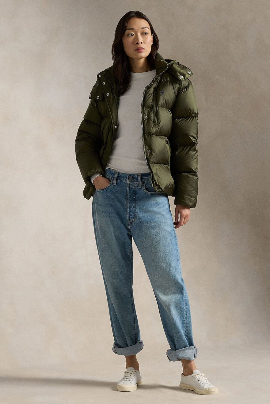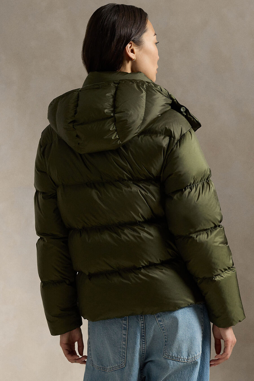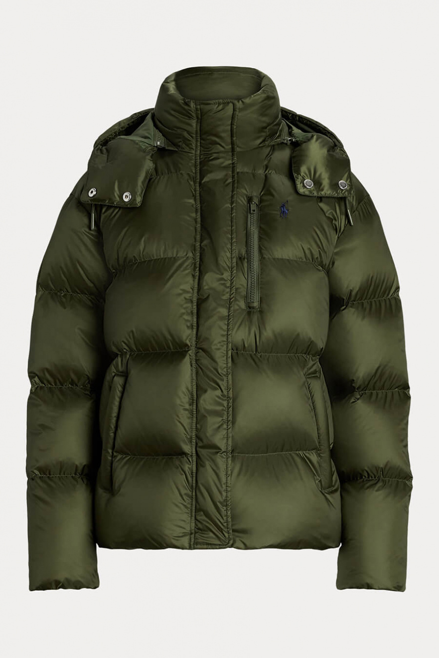 Step into winter's trendiest look with this muted green down jacket that provides both warmth and style. Perfect for layering on top of layers and whether you're in town or out in nature - an obvious choice for chilly days.Down jacket in regular fit with removable hood, pockets at the sides, high collar, closes with a two-way zipper and press buttons from Polo Ralph Lauren.