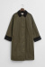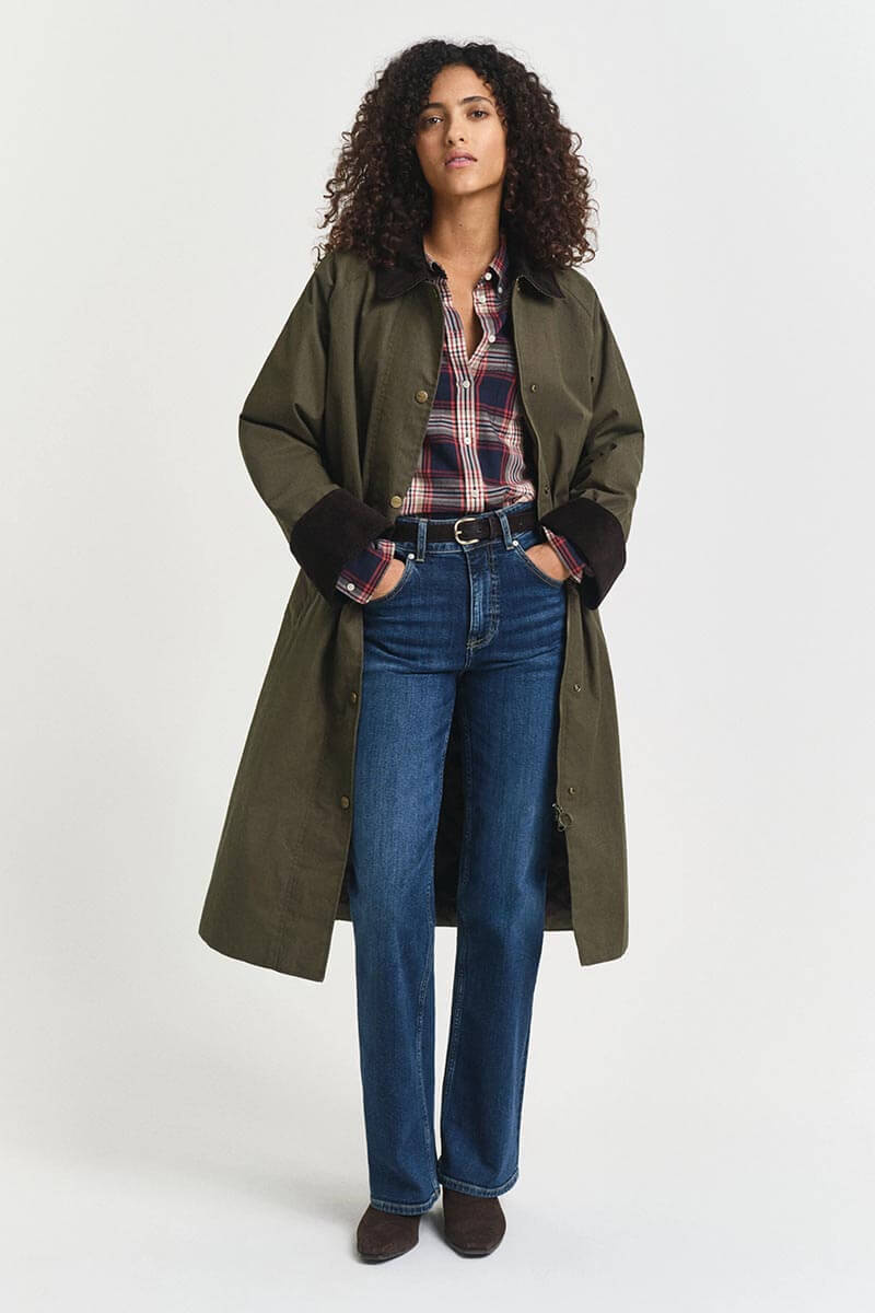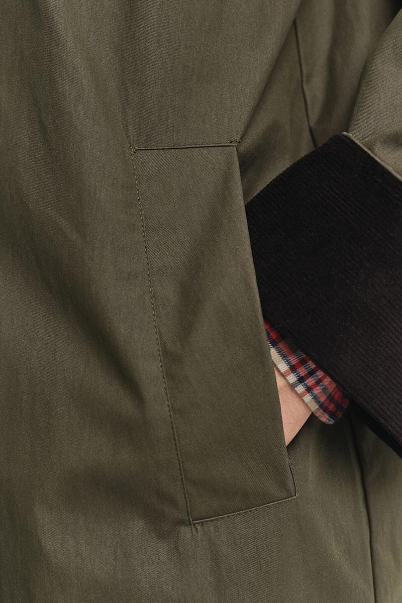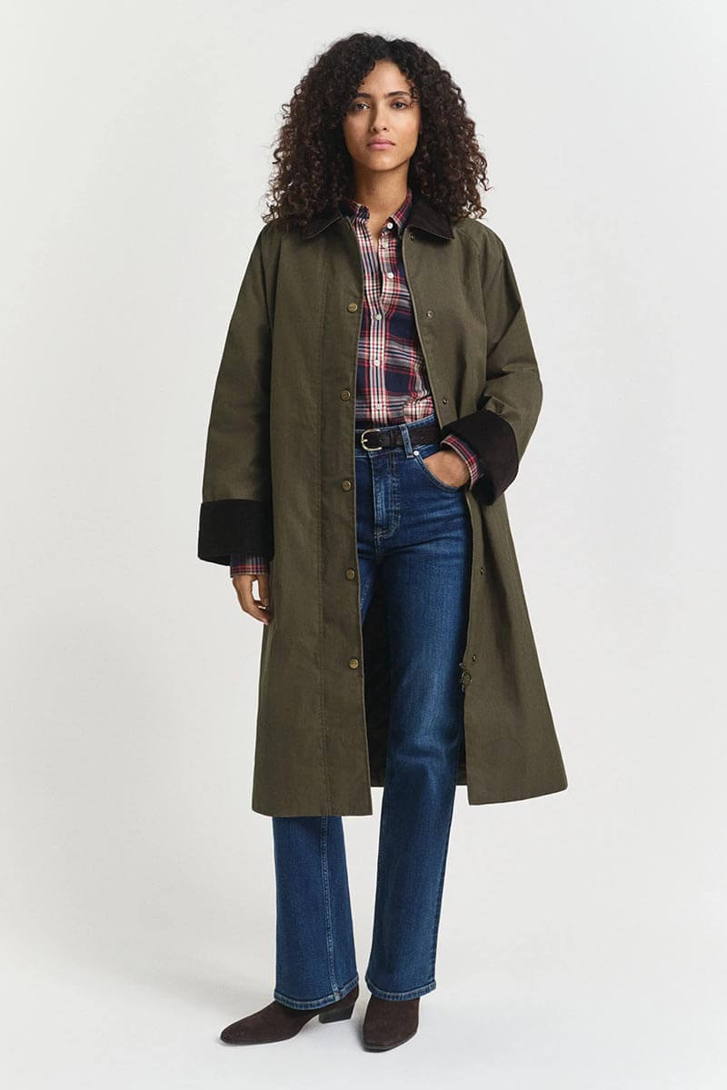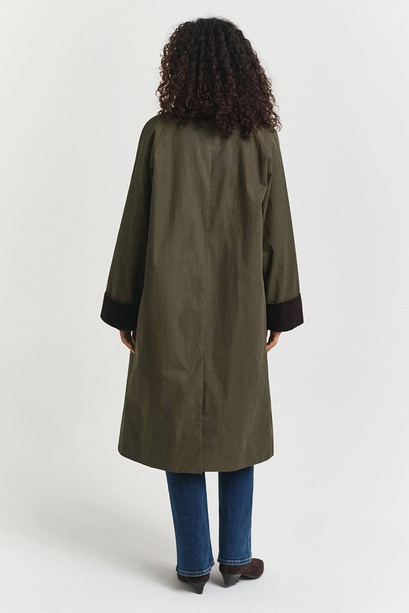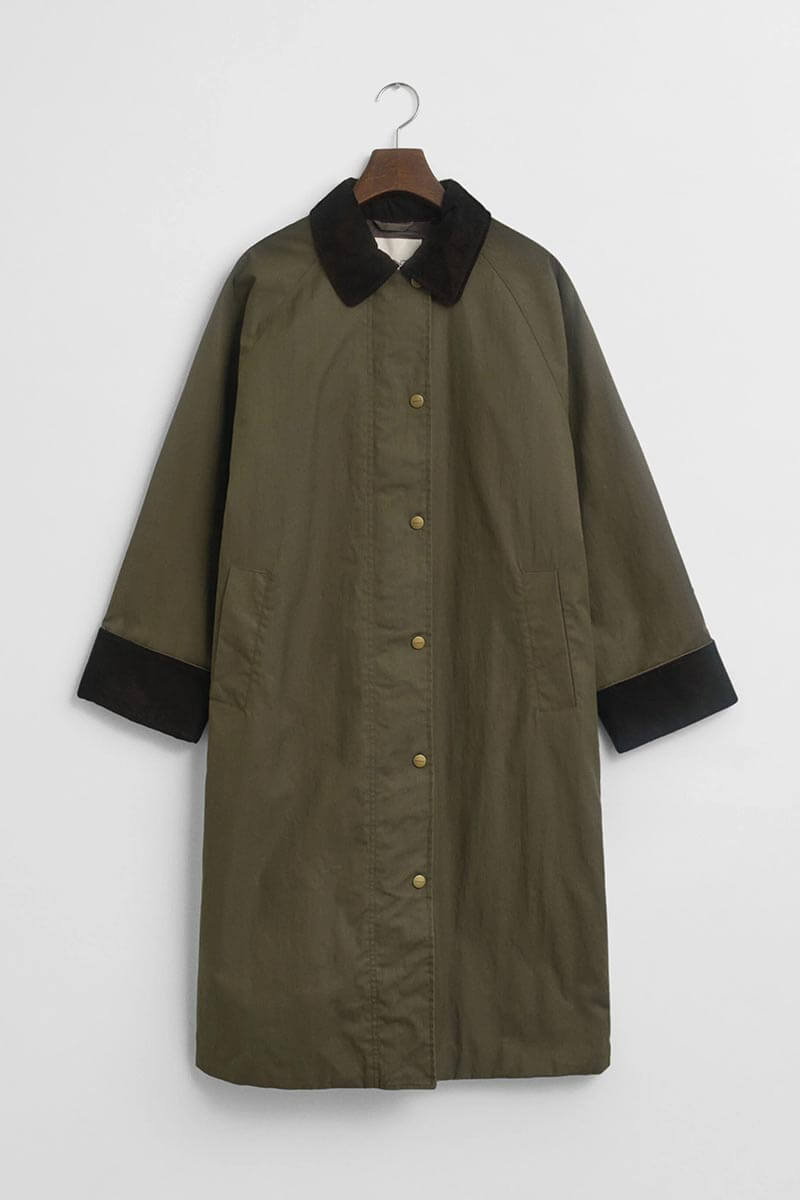 The design is elevated by a contrasting corduroy shirt collar, structured cuffs, and elegant raglan sleeves. Its calf-length cut creates a sophisticated silhouette, while practical details such as angled welt pockets, an inside pocket, back vent, and logo-embossed metal press studs make the coat as functional as it is refined.