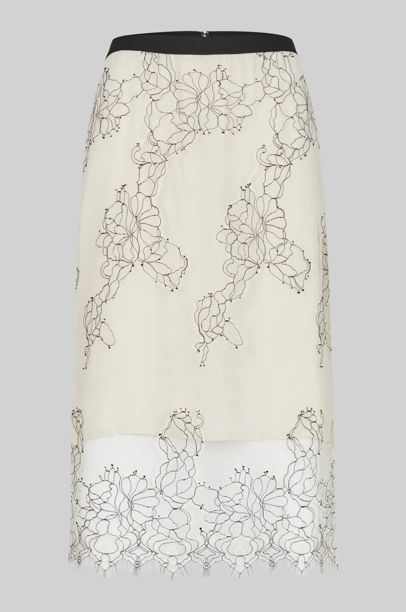 A feminine lace skirt from Second Female, crafted from a lightweight, sheer lace fabric with contrast stitching. The skirt features an elastic waistband in a contrasting color and a concealed back zip. Finished with a decorative scalloped hem and a partially lined interior. The slim, straight fit creates an elegant and modern silhouette.