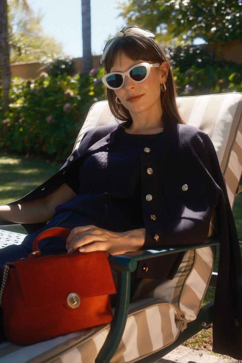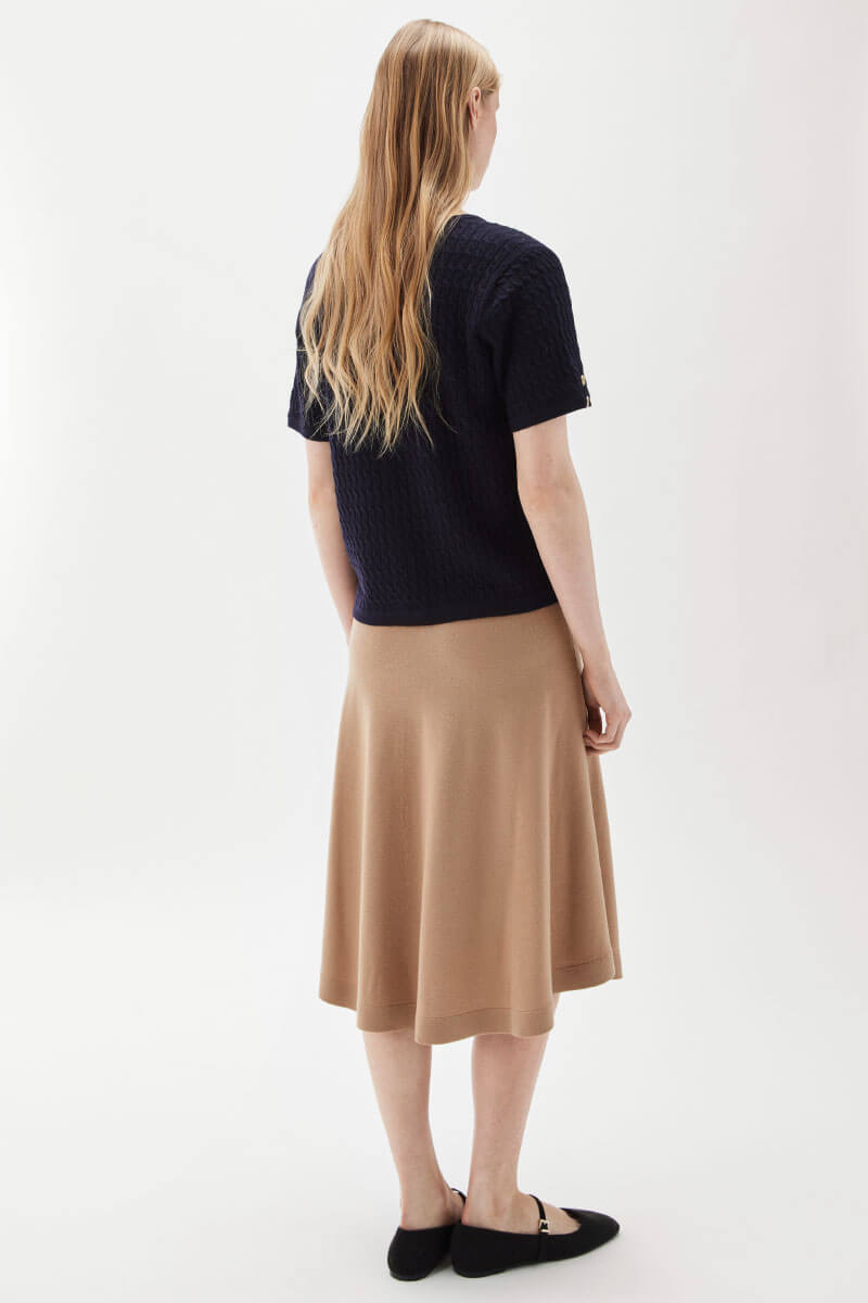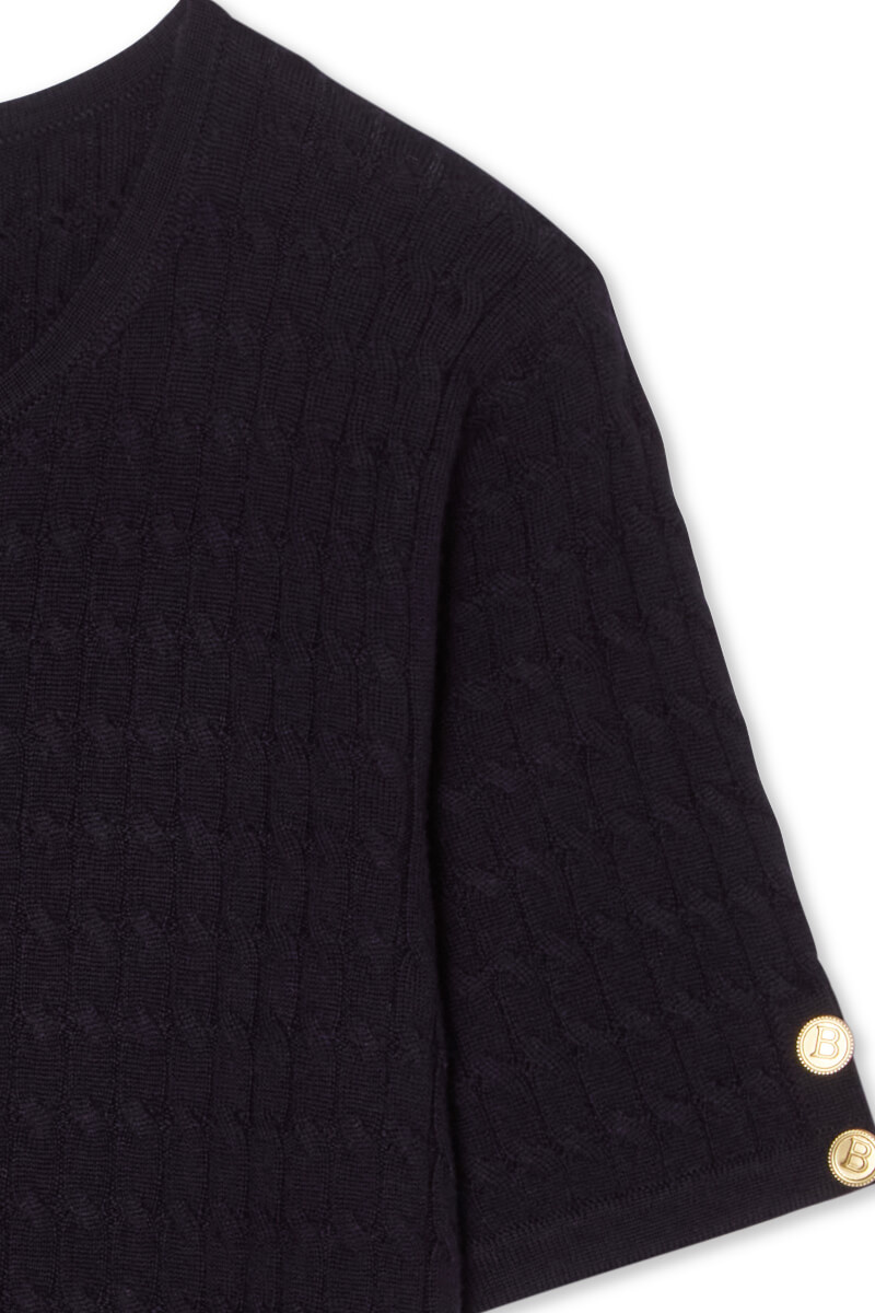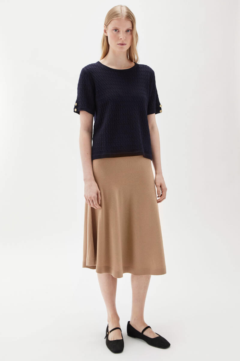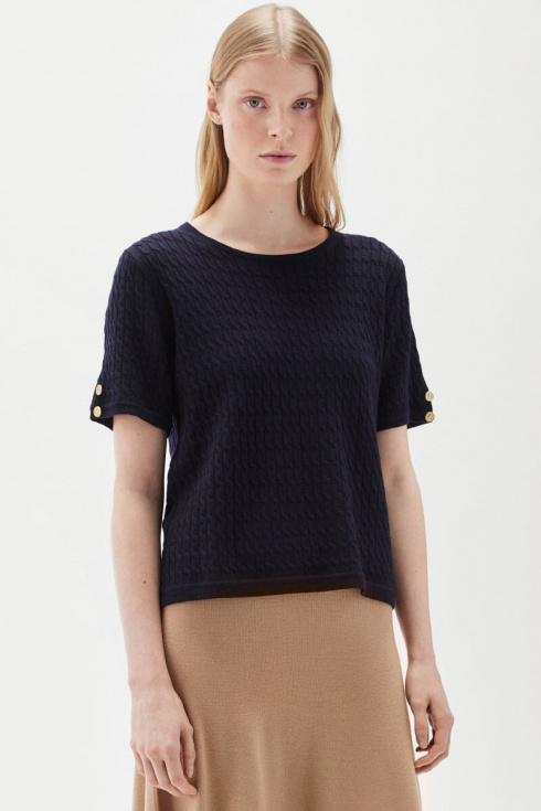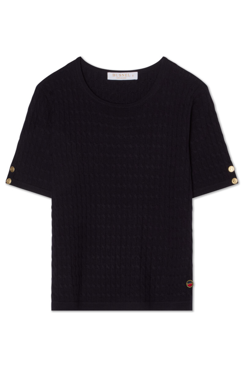 A cable knit short sleeve top with a round neckline gives a fresh and unexpected twist on knitwear. Match with wide suit trousers for a chic contrast or combine with a slim skirt for a more feminine silhouette - timeless knitted elegance in a new form.Cable-knit top in soft merino wool with a regular fit, round neckline, gold-colored buttons at the end of sleeves and small embroidered logo at the cuffs from Busnel.