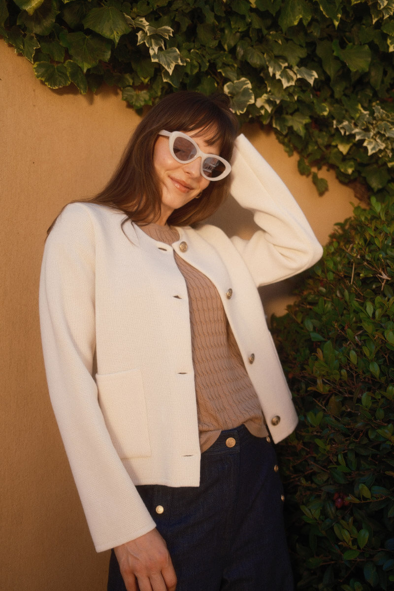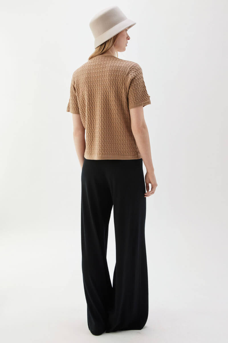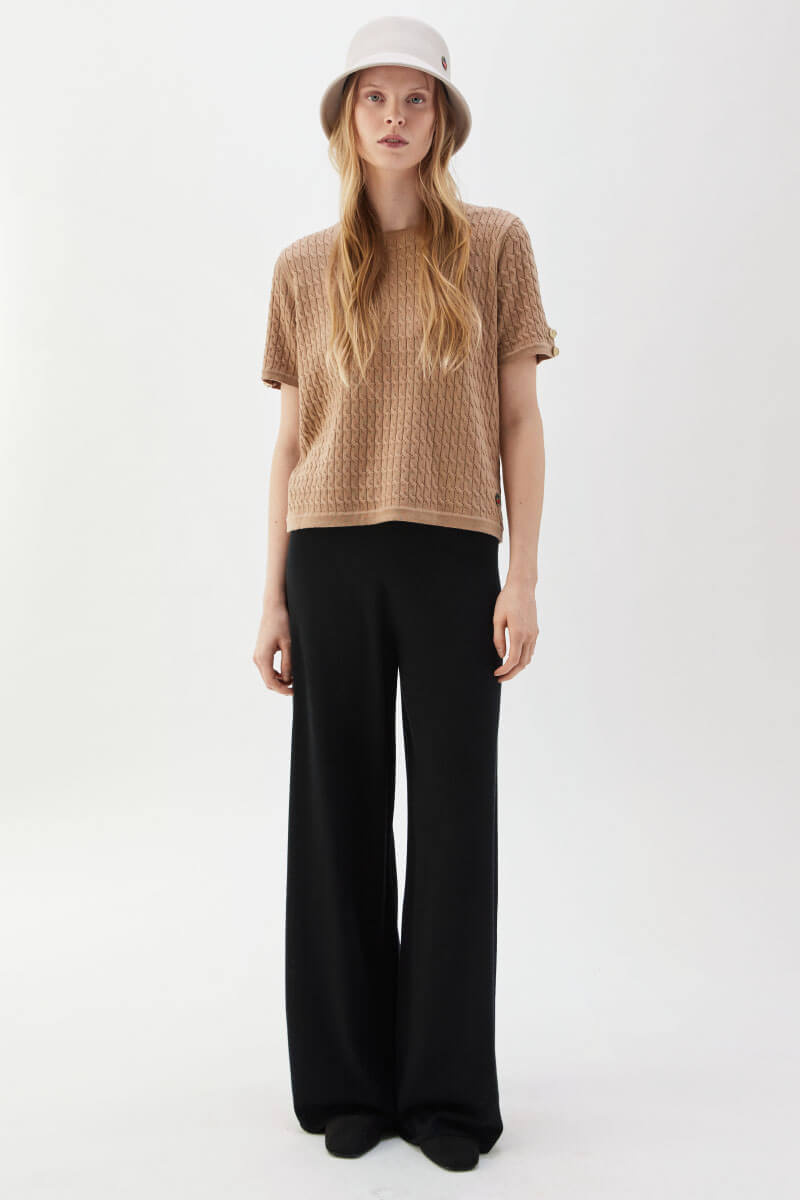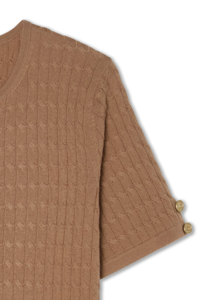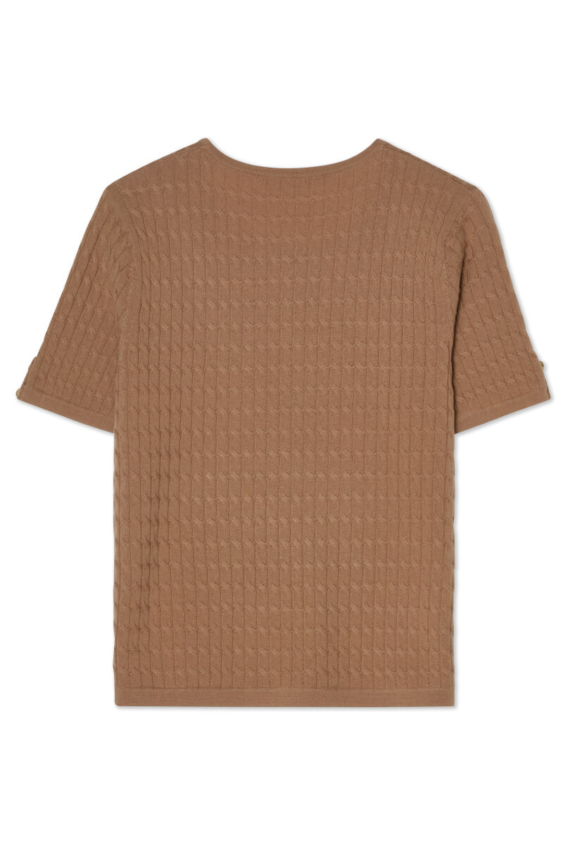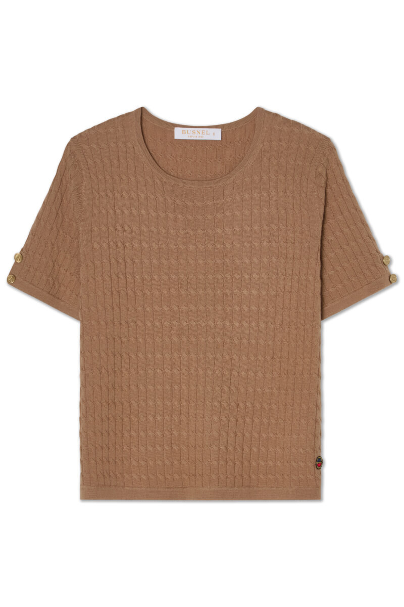 A cable knit short sleeve top with a round neckline gives a fresh and unexpected twist on knitwear. Match with wide suit trousers for a chic contrast or combine with a slim skirt for a more feminine silhouette - timeless knitted elegance in a new form.Cable-knit top in soft merino wool with a regular fit, round neckline, gold-colored buttons at the end of sleeves and small embroidered logo at the cuffs from Busnel.