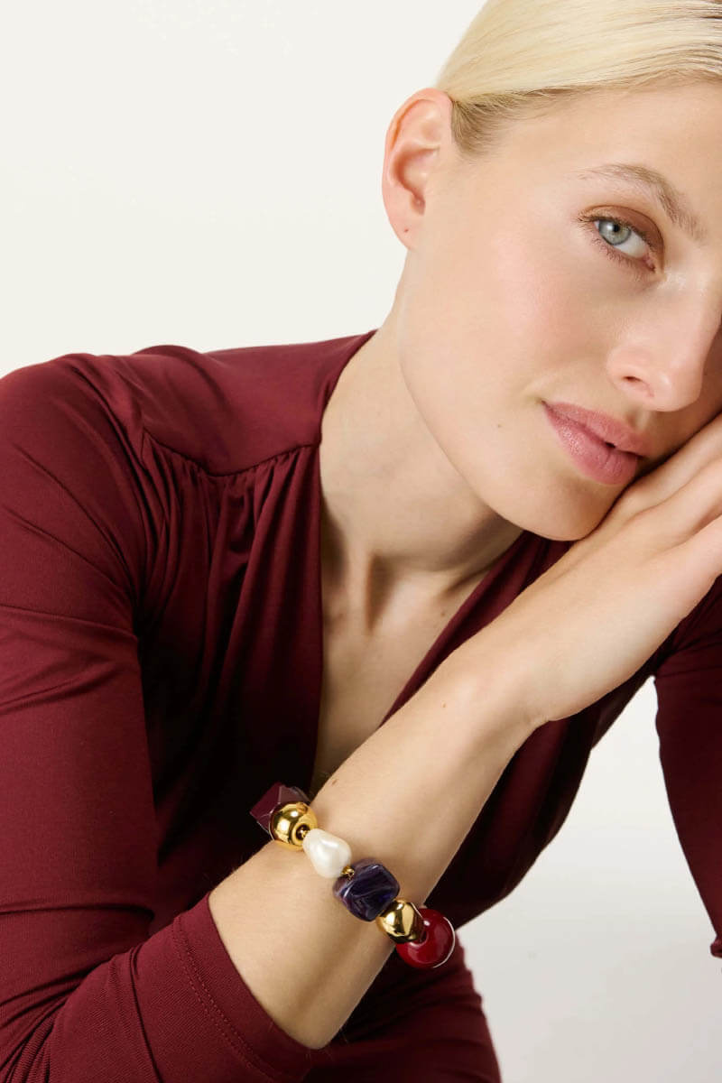 Each pearl is carefully selected to create a dynamic structure and a vibrant, expressive look – a bracelet with strong character and contemporary elegance.