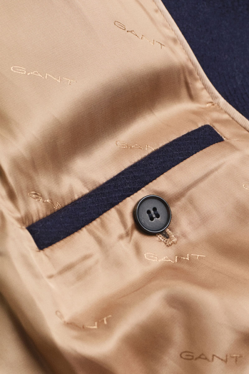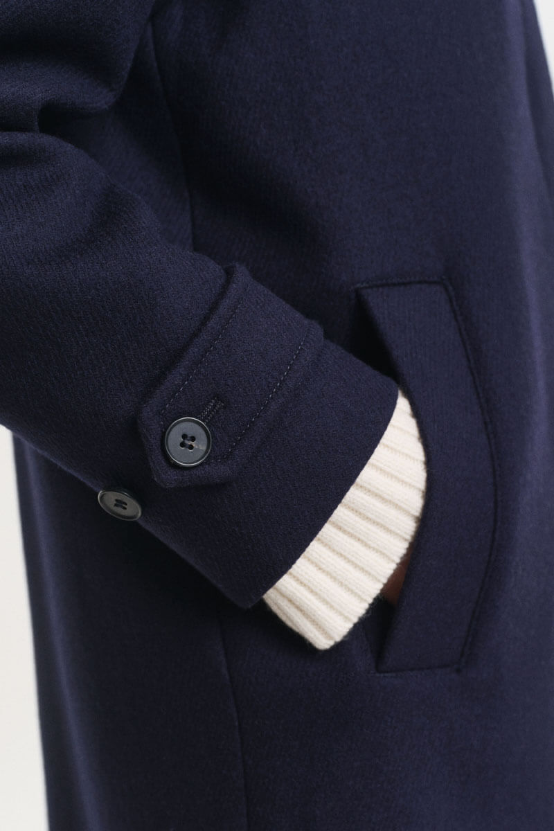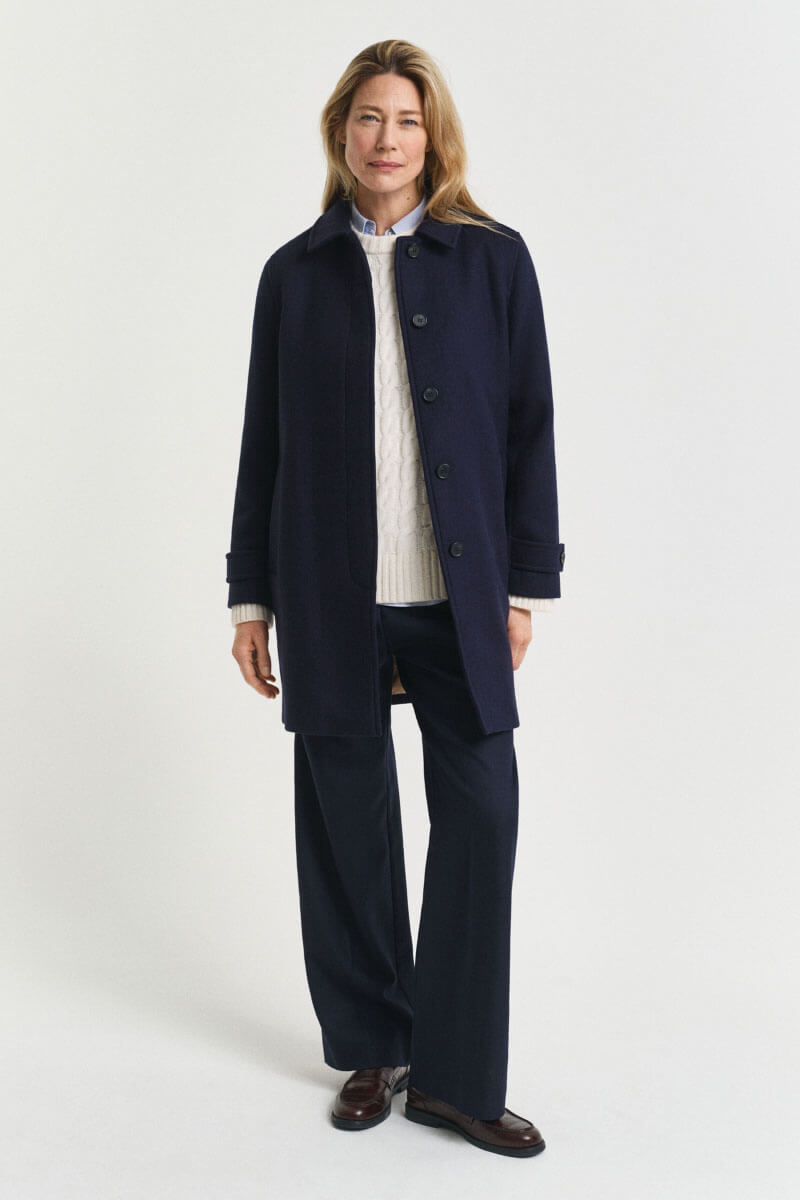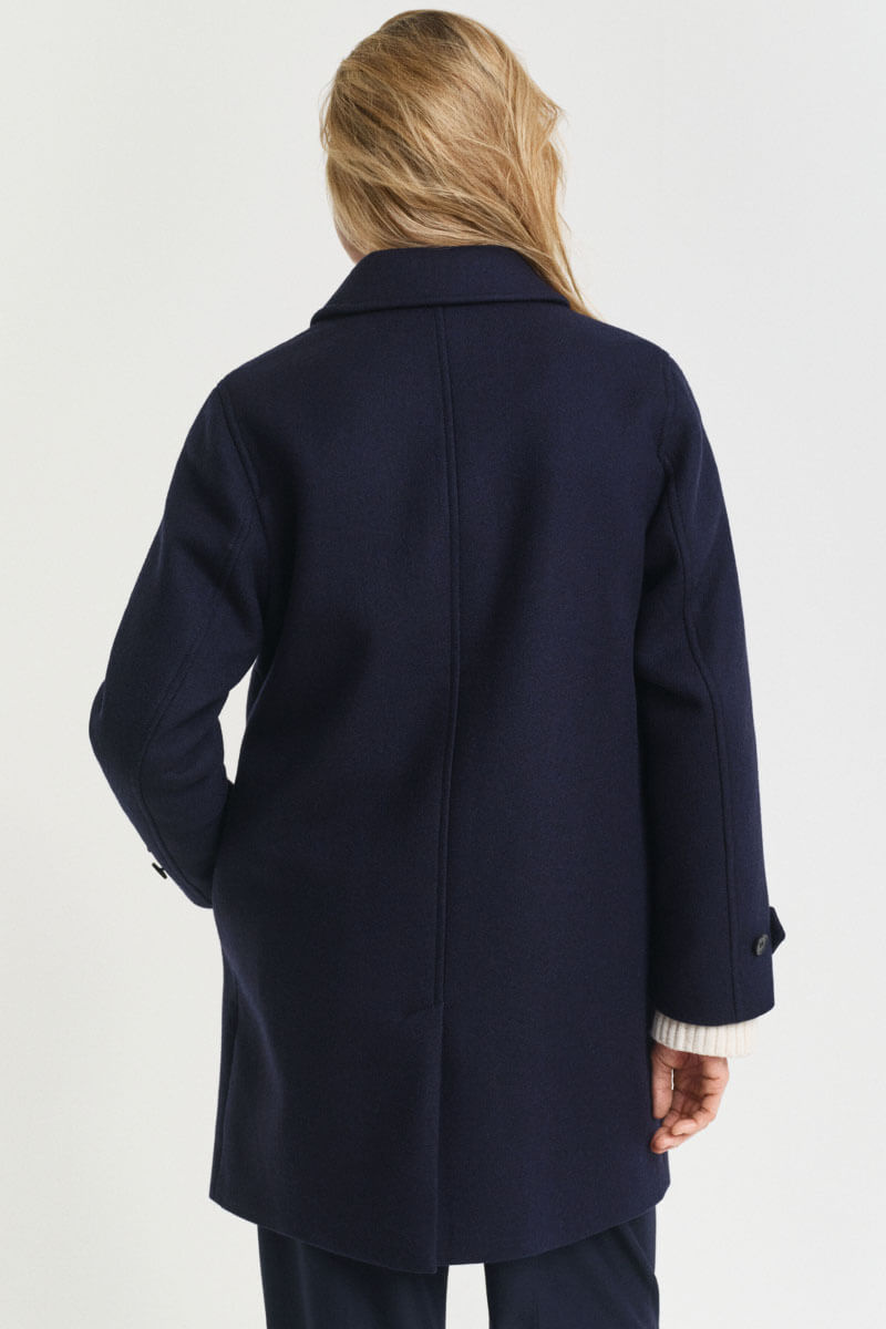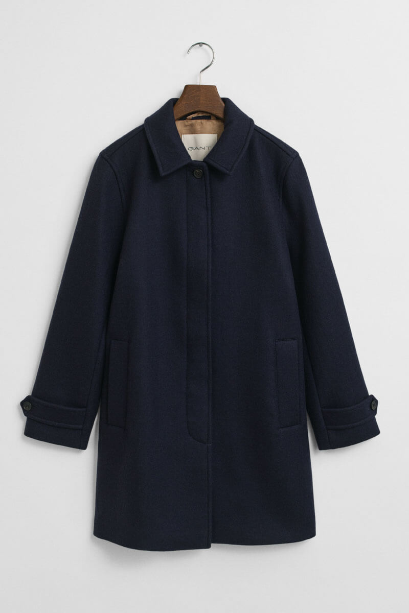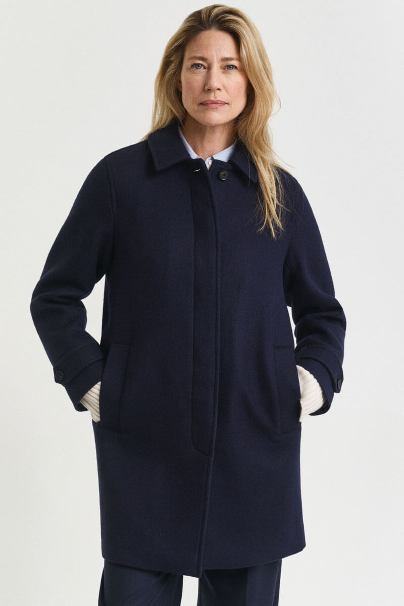 A dark blue car coat in a soft wool blend and loose fit creates a timeless, elegant silhouette. Wear over a knitted polo shirt and wide-leg trousers for everyday luxury, or with a satin dress and boots for a sophisticated evening look.Coat in a wool blend with a loose fit, side pockets, collar, fully lined and closed with hidden buttons at the front from Gant.
