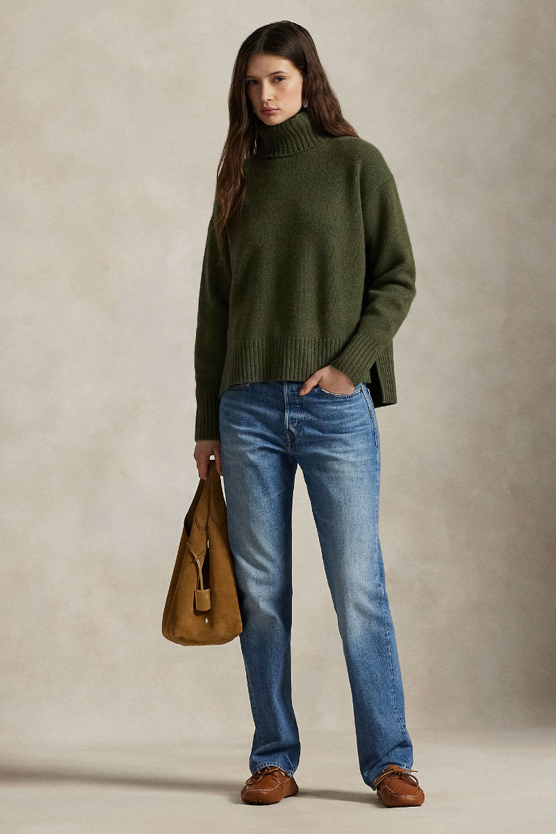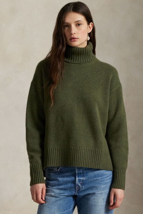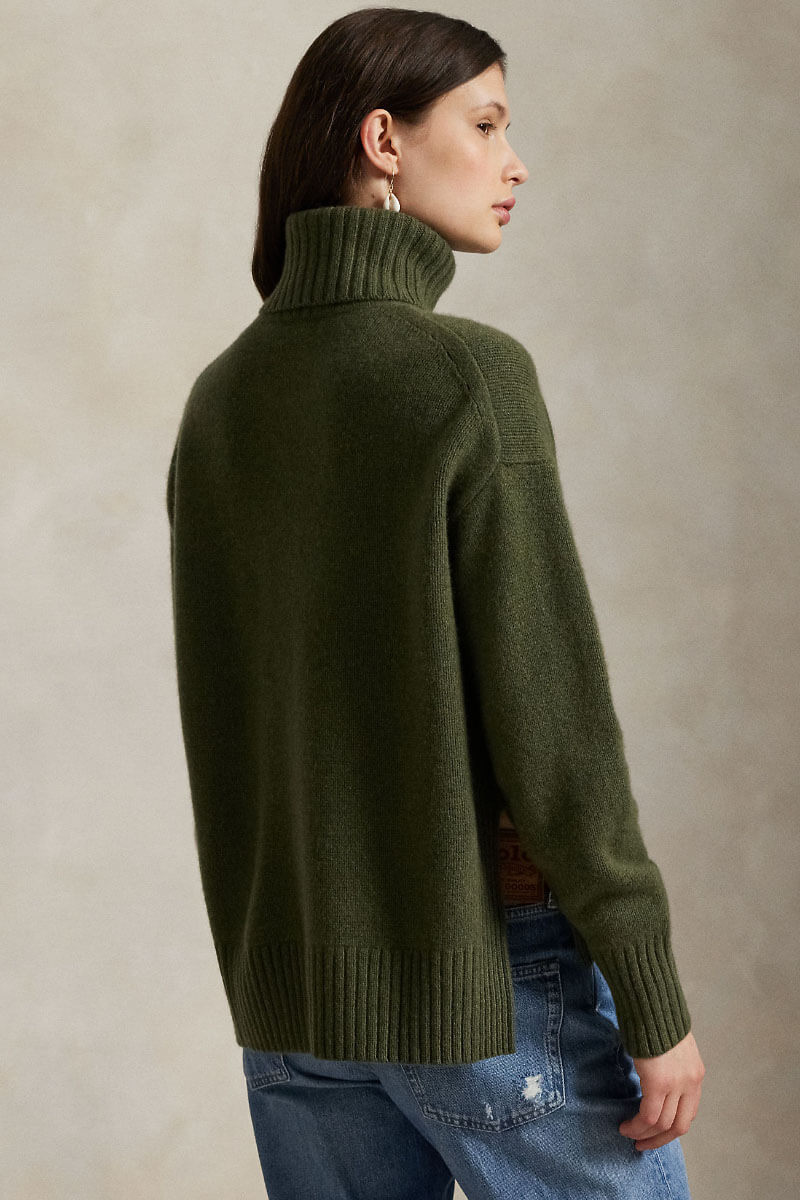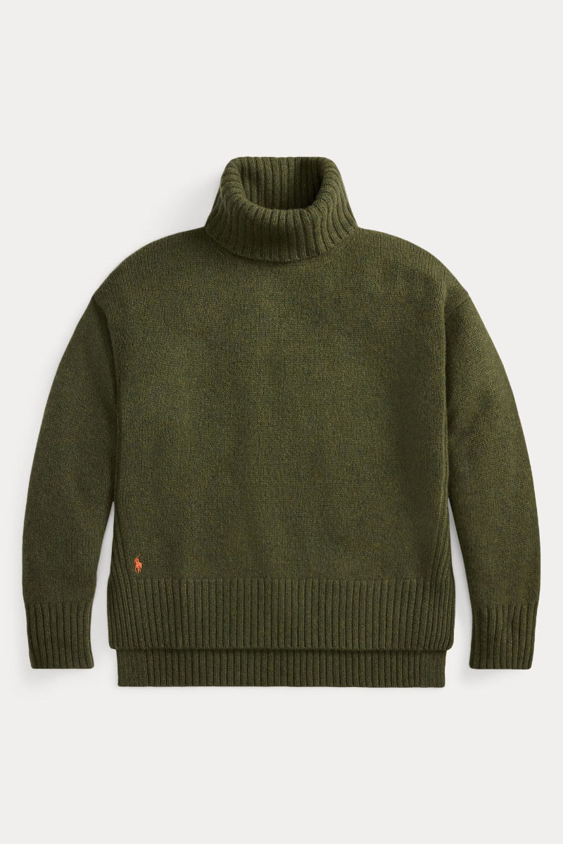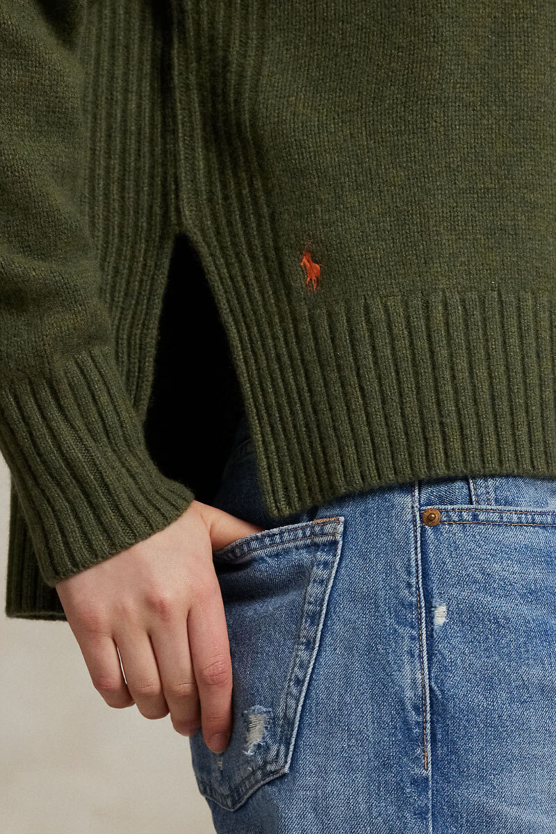 Olive green wool polo shirt – sophisticated and casual. The hue flirts with minimalism and adds structure to an otherwise simple look. Cosy meets style-conscious sharpness.Knitted wool sweater with a loose fit, polo collar, ribbed edges, small embroidered logo, side slits and dropped shoulder seams from Polo Ralph Lauren.