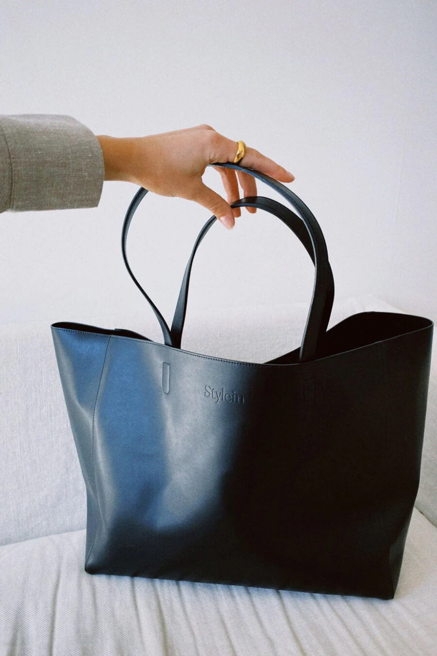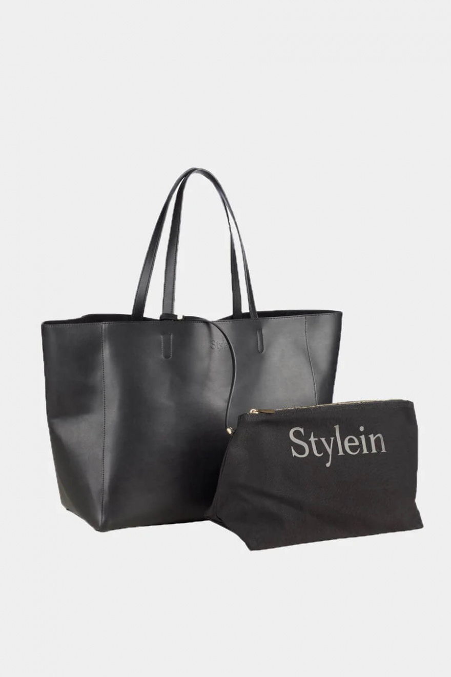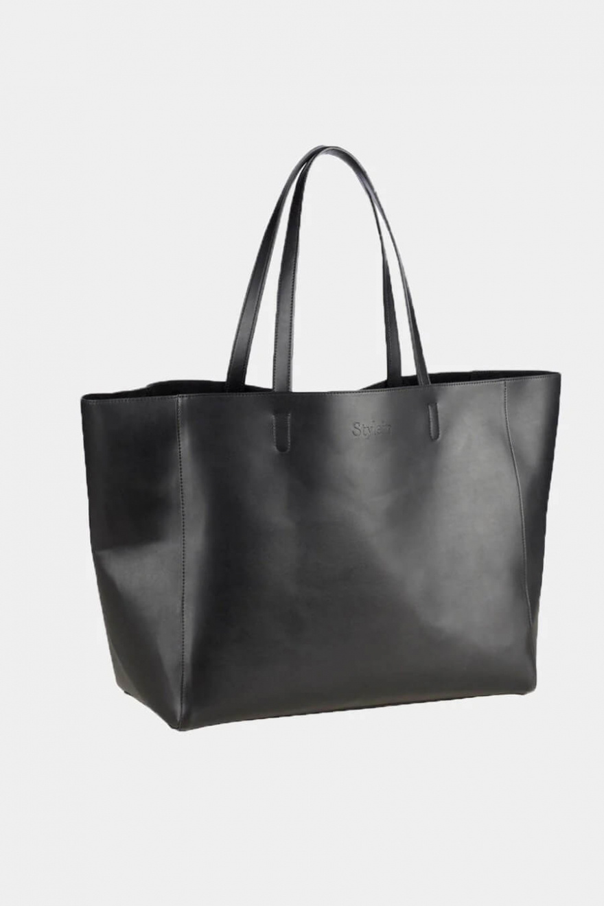 Large shopping bag in vegan leather with a reinforced bottom plate for stability, inner bag in cotton canvas, double handels and embossed logo at the front from Stylein.- 100% Polyuretan