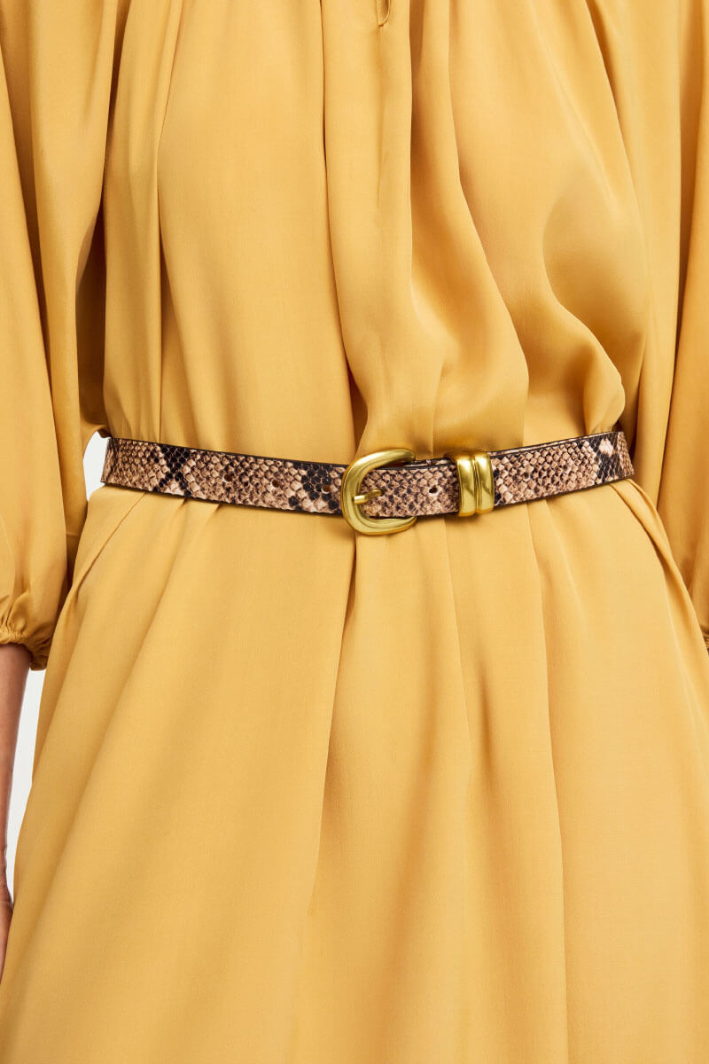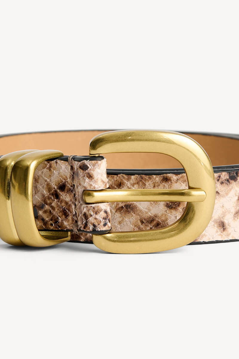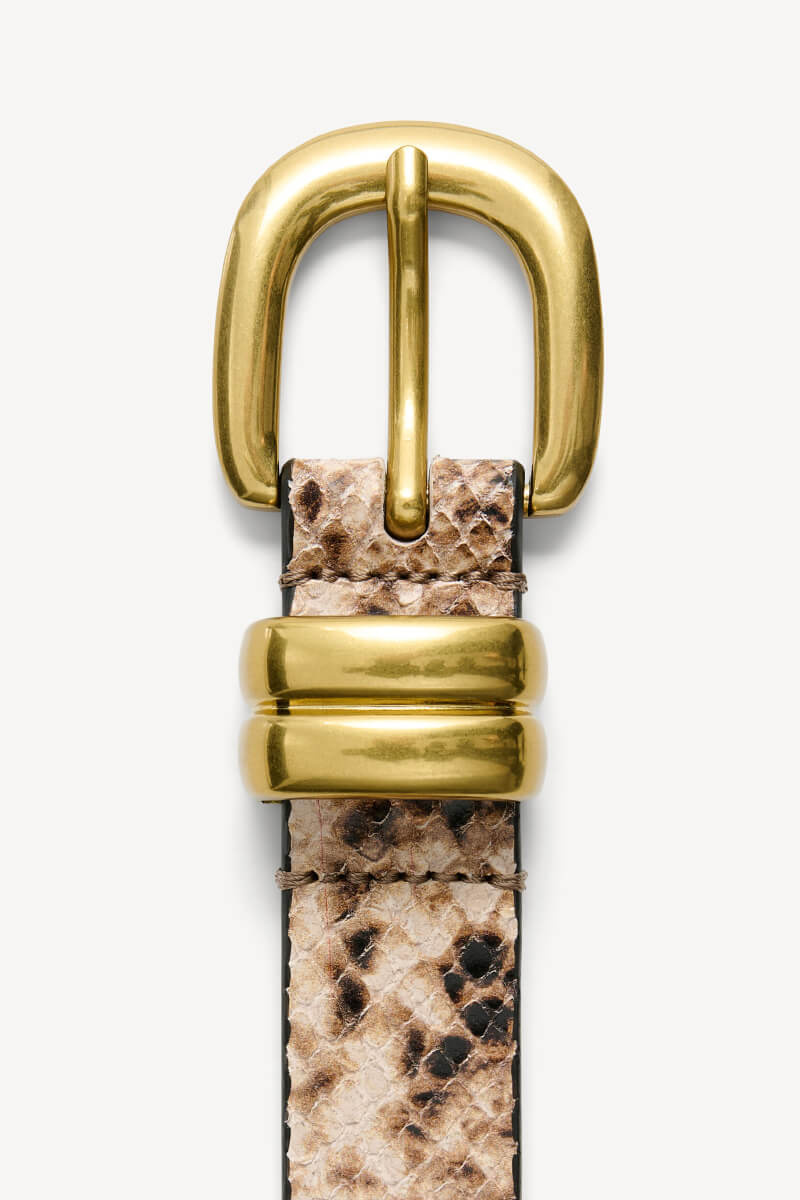 The brown snakeskin belt is the accessory that sets the tone. The animal print adds a subtle edge, while the shade keeps it sophisticated. Style over a dress, blazer or jeans - a waist marker that transforms the entire silhouette.Belt in leather with gold colored buckle, adjustable length and a buckle at the end of the belt for easy use from By Malene Birger.
